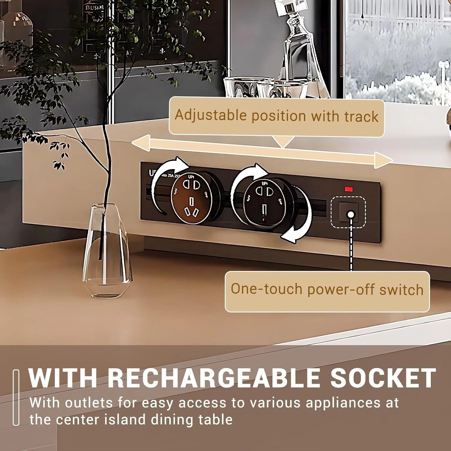 Multi-functionality: To enhance convenience, it's thoughtfully fitted with sockets for charging electronic devices effortlessly and rapidly. With wheels for easy rolling, the kitchen island table can be rolled around to suit your layout and needs.