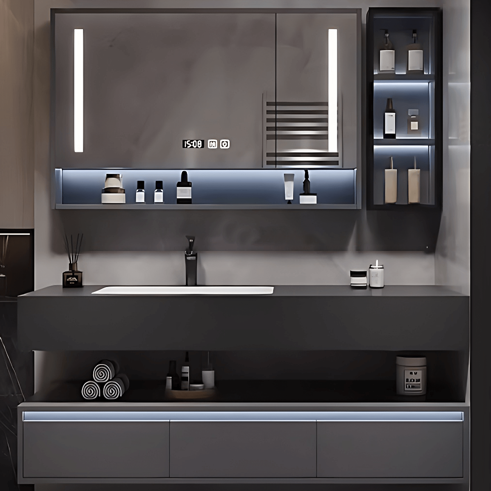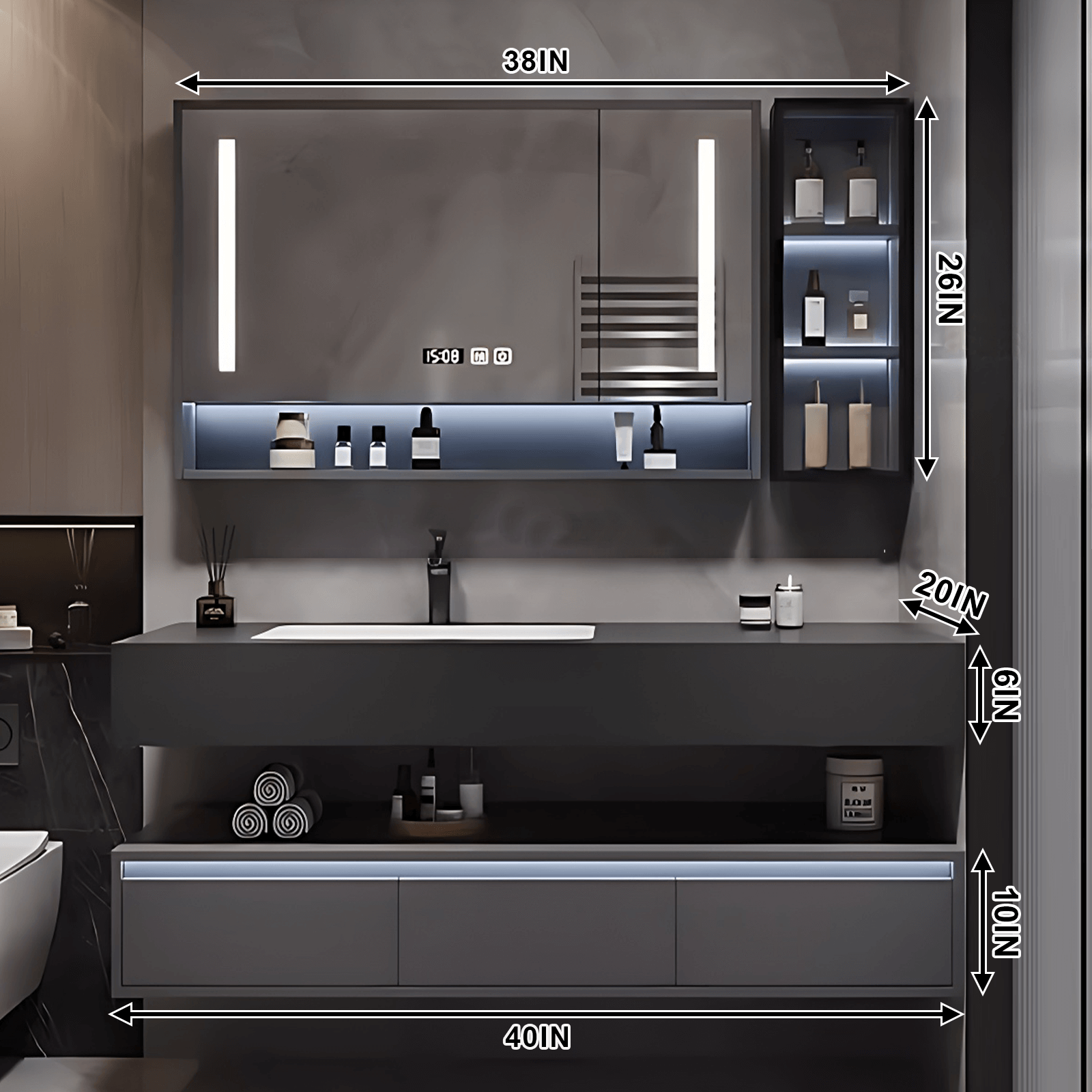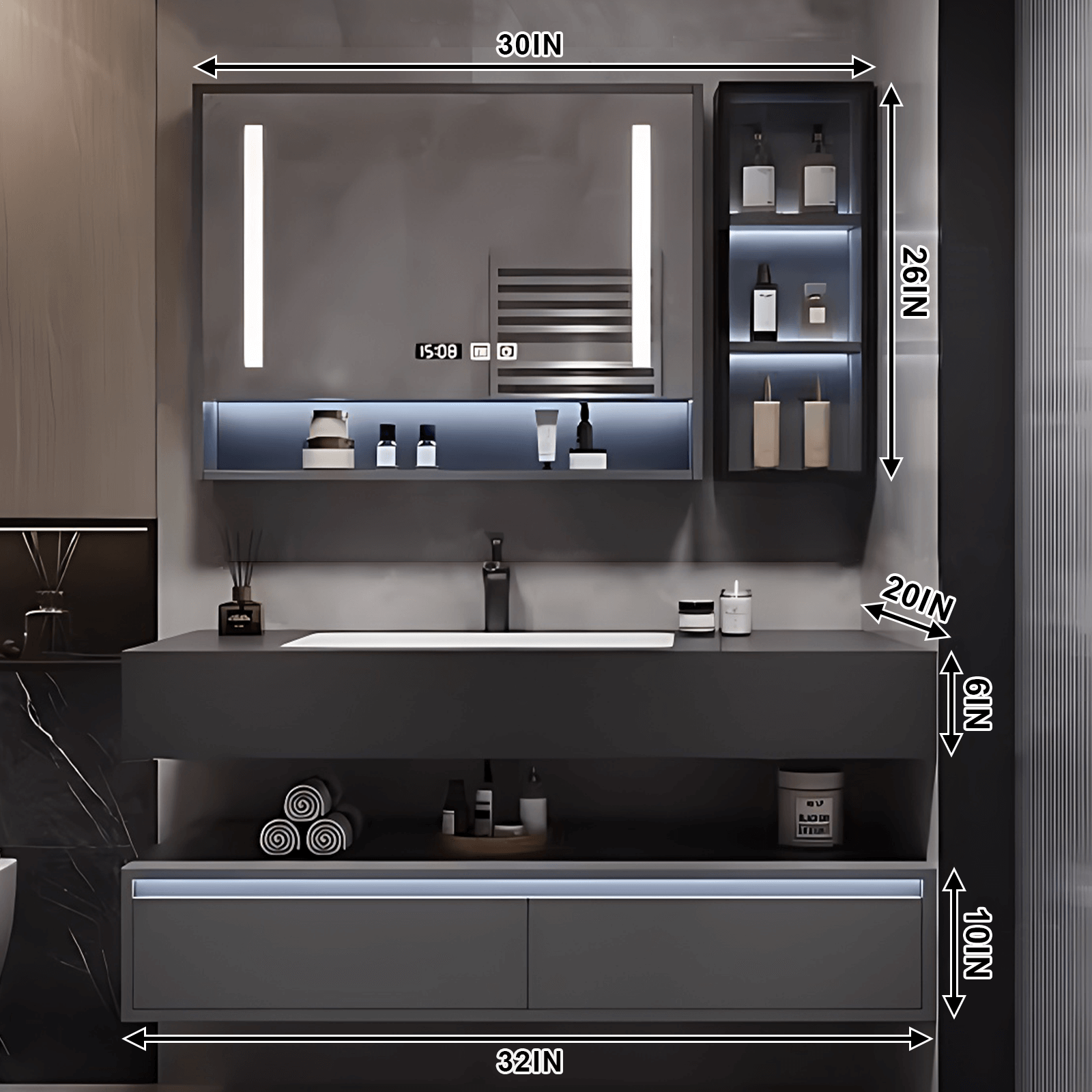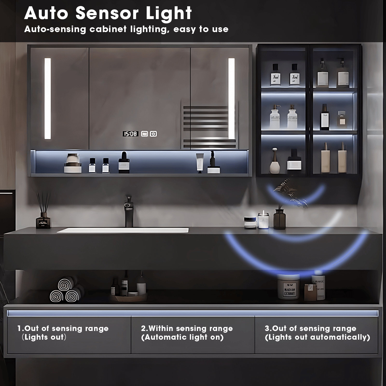 Intelligent Lighting System: Our bathroom vanity's smart motion-activated lighting system integrates seamlessly into the sideboard, allowing you to experience unparalleled convenience. When you open the cabinet, the light will automatically turn on, saying goodbye to darkness and providing a better view, allowing you to easily access items. Embrace the fusion of technology and functionality to enhance your daily life, ensuring a more efficient and enjoyable experience with our bathroom vanities.