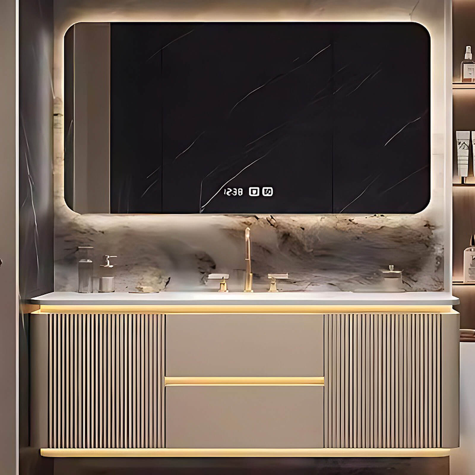Intelligent Defogging Mirror: Elevate your grooming experience with the square-shaped intelligent defogging mirror included with our vanity. Say goodbye to foggy mirrors after hot showers, as this smart mirror automatically clears any mist, providing you with a clear reflection every time. The defogging technology ensures a hassle-free grooming routine, making your daily rituals more convenient and enjoyable.