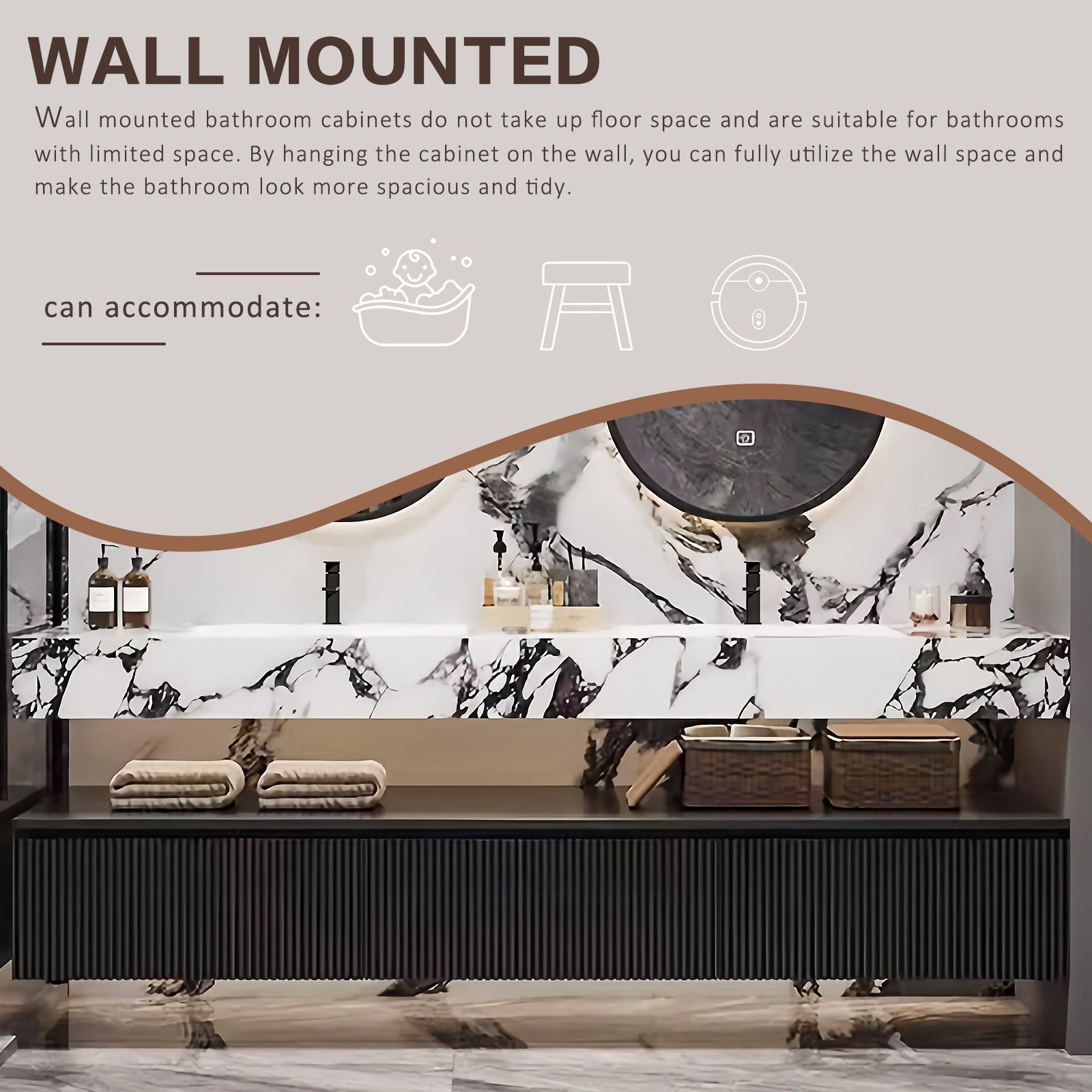 Striped Design Bathroom Vanity: Embrace the glamor of modern elegance with our collection of wavy stripe bathroom vanities. Featuring a stylish black embossed striped wave design, our vanity embodies a seamless blend of style and function. Paired with chic slate countertops with a marble vein pattern, this set exudes a modern sophistication that's perfect for a modern home.
