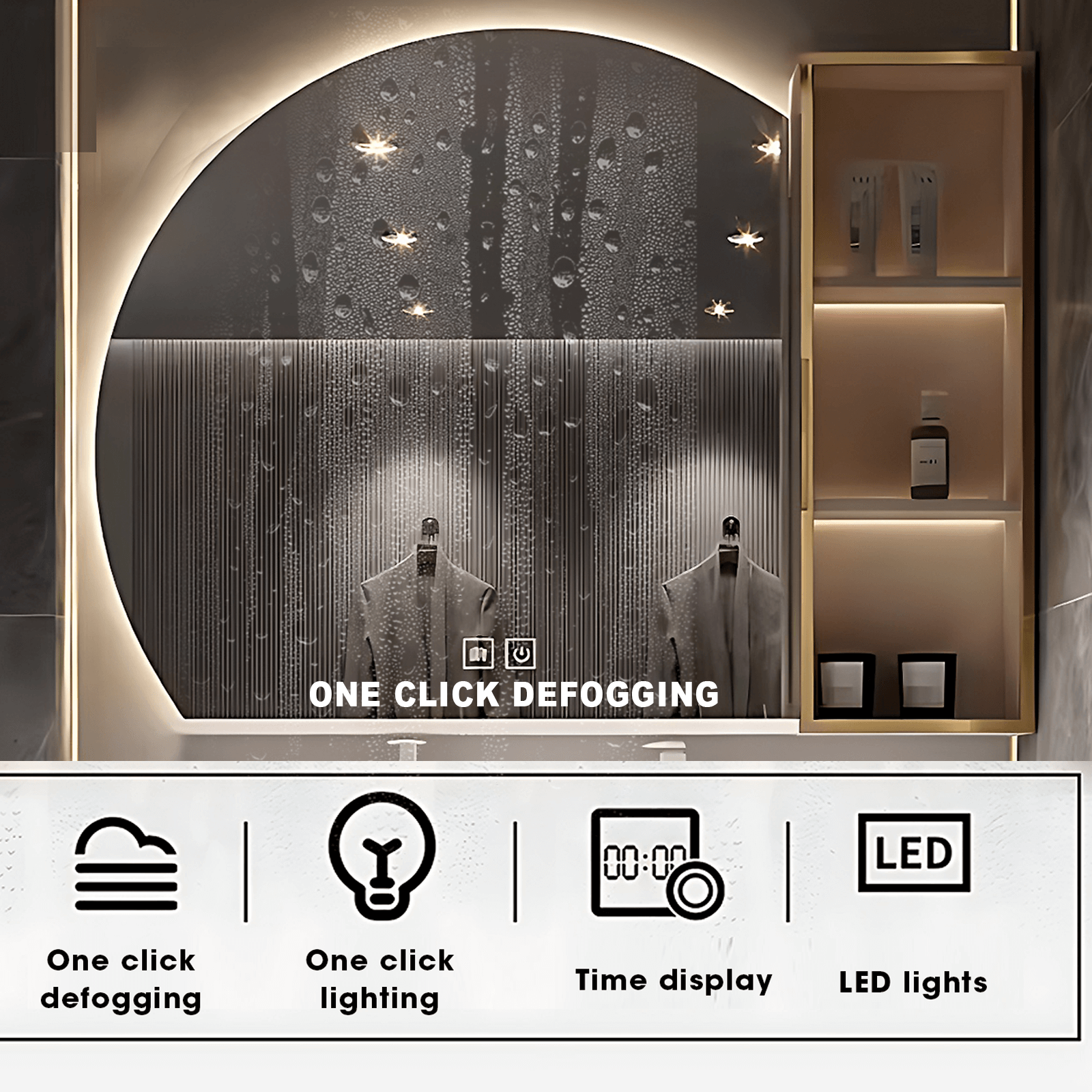 One-Touch Smart Mirror: Simplify your mornings with our innovative smart mirror, equipped with one-touch defog function for instantly clear reflections. Easily complete your beauty routine with built-in lighting, providing enhanced illumination for perfect grooming. Stay on schedule with convenient time display to help you manage time effectively.