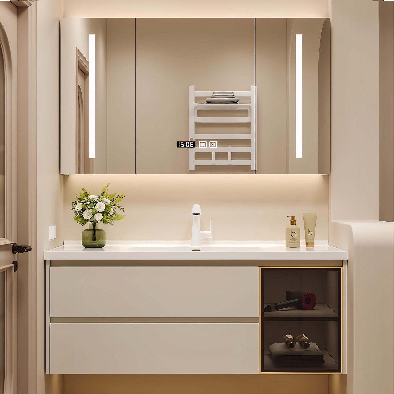 Simplified Storage Solutions: Boost your organizational capabilities with our carefully crafted three-tier layout dresser. Experience the epitome of functionality, our defogger mirrors seamlessly transform into smart cabinet doors, revealing neatly partitioned compartments for all your essentials. Drawers and cupboards are cleverly placed, combining practicality with elegance, while the hanging lower section ensures easy access and effortless cleaning.