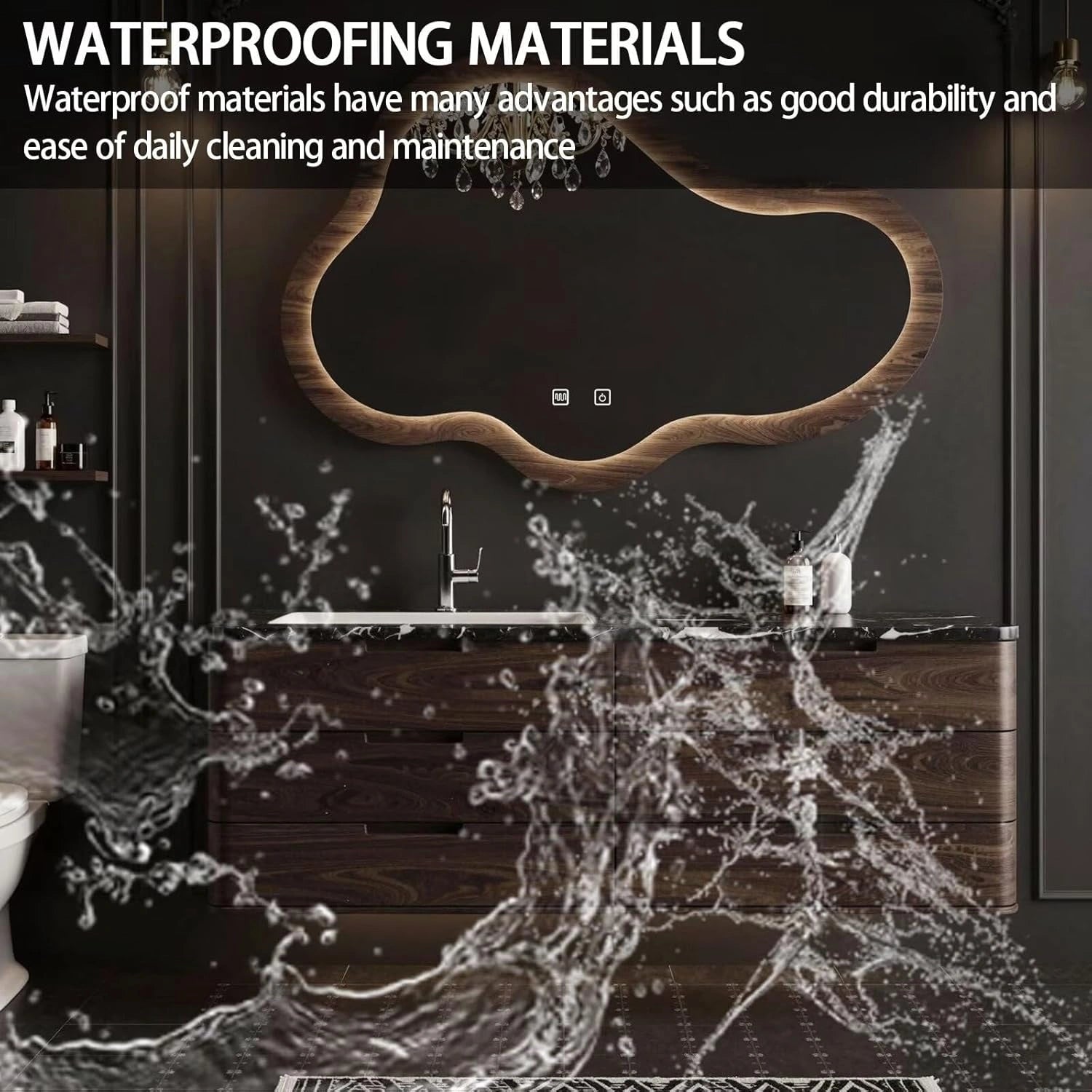 Smart Multi-Function Mirror: The irregular mirror includes smart features such as LED ambient lighting along the wooden frame and touch-control defogging, ensuring a clear reflection even in a humid bathroom environment.