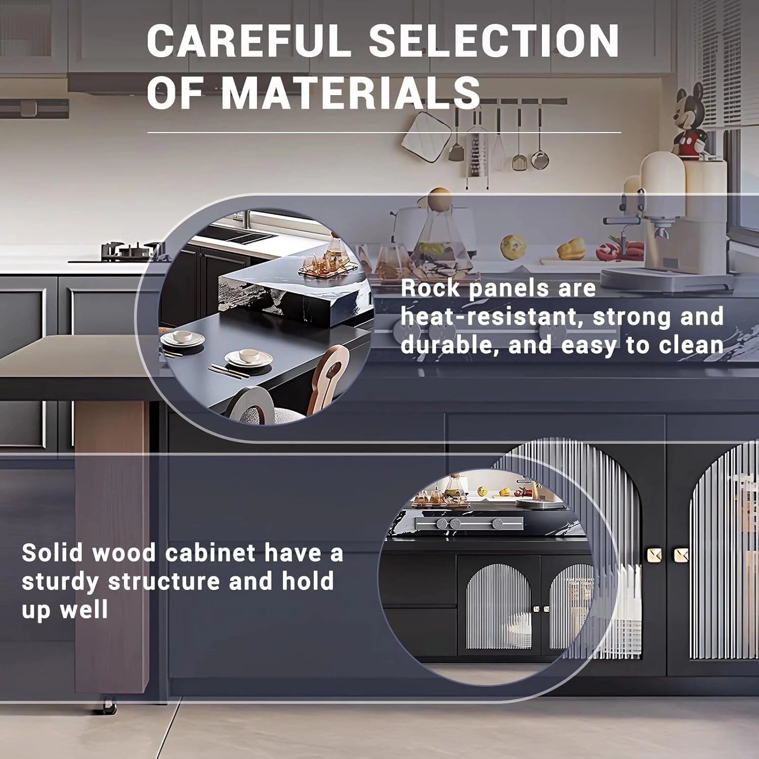 Expert Craftsmanship & Durability: The island countertop and upper frame are crafted from engineered composite rock slab—blending aesthetic appeal with practical utility. The main body is meticulously crafted from solid wood, renowned for its long-lasting sturdiness and durability.
