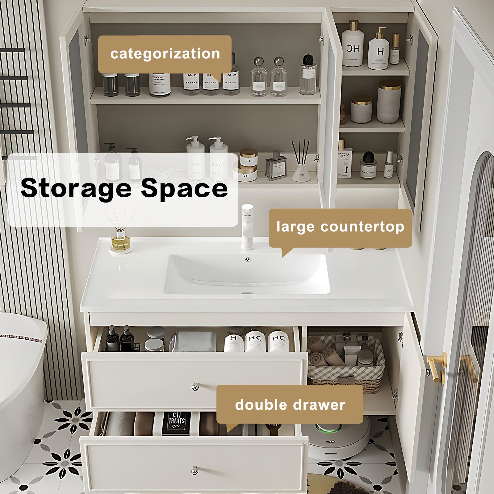Hardware and Finishes: The hardware and finishes of the vanity are carefully selected to complement its design and functionality. The black faucet adds a touch of modern flair, contrasting beautifully with the white ceramic basin. The mirror cabinet with glass mirror edges enhances the vanity's elegance and offers additional storage space for smaller items. Premium hardware such as handles, hinges, and drawer pulls ensure durability and ease of use, enhancing the overall user experience.