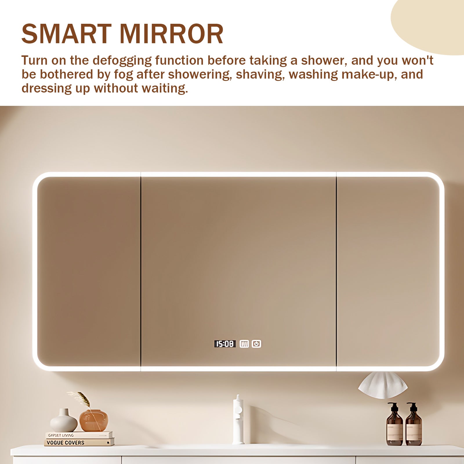 One-Touch Smart Mirror Cabinet: The mirror design incorporates smart technology, and the touch operation allows users to start the mirror defog function with one button to keep the mirror clear and avoid fogging caused by water vapor when washing. The hidden storage space in the mirror cabinet is cleverly designed to provide a convenient storage location for small items such as daily cosmetics and skin care products, further saving bathroom space and keeping it tidy. The mirror switch is sensitive to touch, simple and convenient, making the entire bathroom experience more intelligent and efficient.