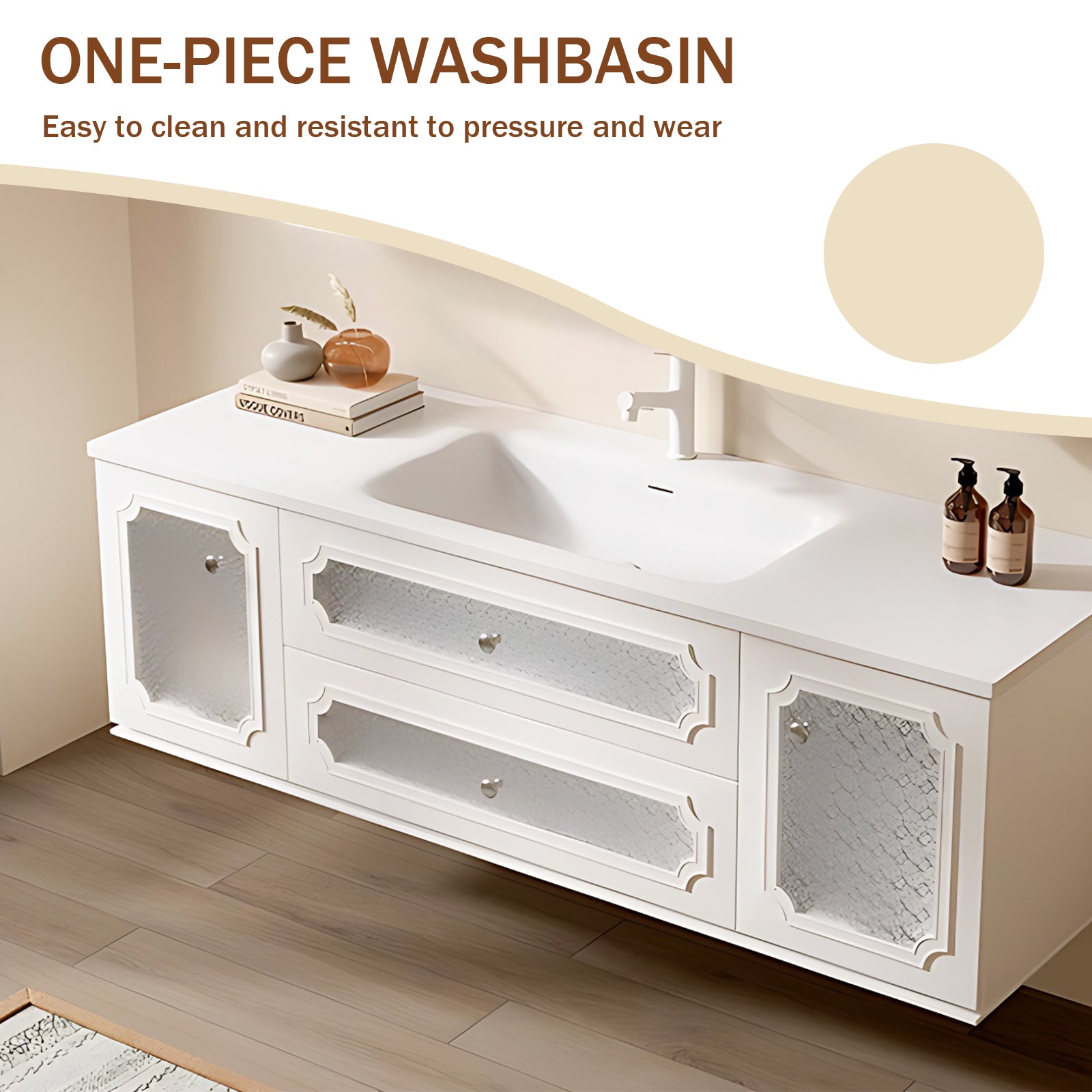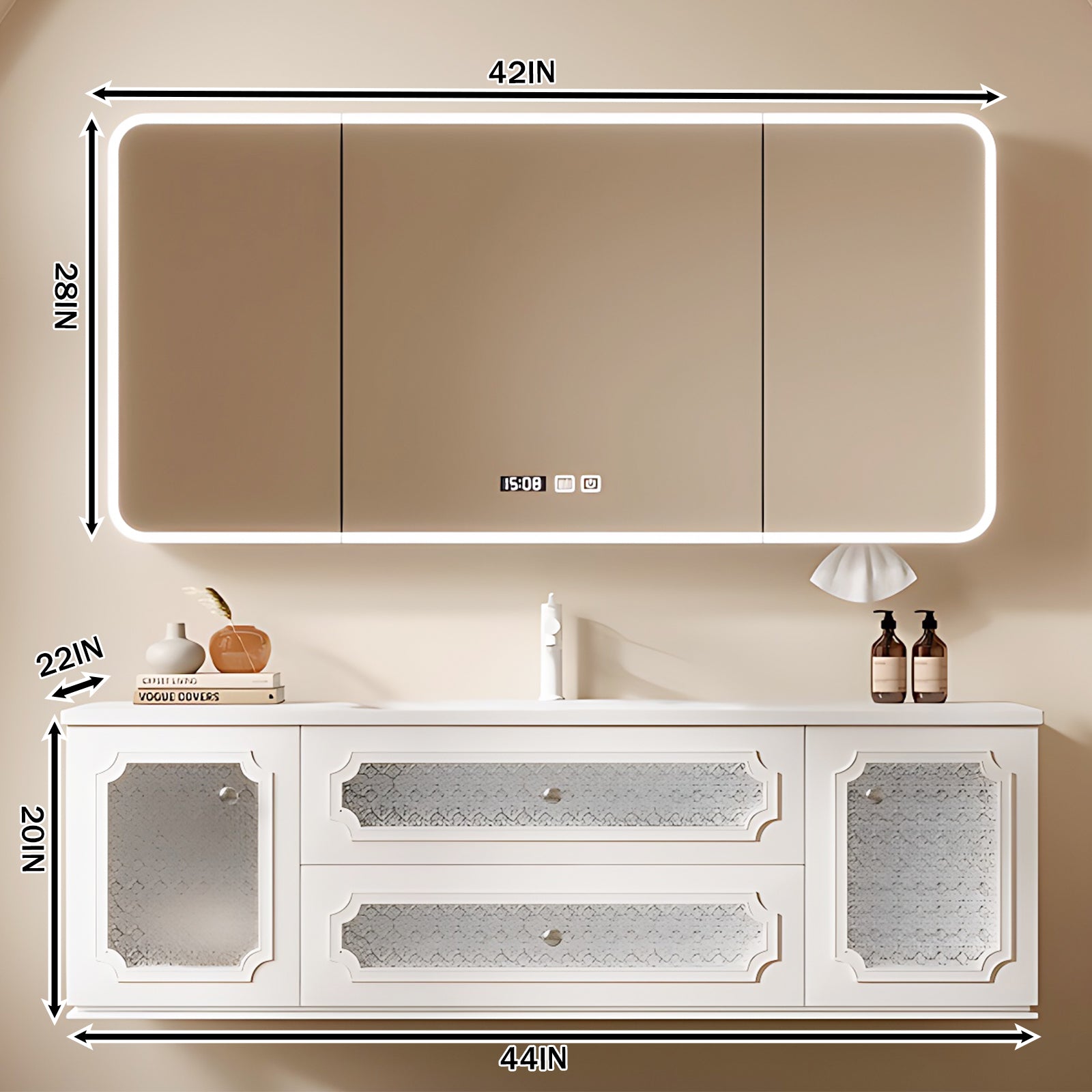 Ample Storage Space: The design of the mirror cabinet and the sink cabinet is combined to provide a large amount of storage space. The cabinet is equipped with a glass cabinet door, which can clearly display the storage items and keep them tidy. The storage space is reasonably divided, which can effectively store skin care products, toiletries, towels, etc., while making the space look more orderly, avoiding clutter, and enhancing the cleanliness and comfort of the bathroom.