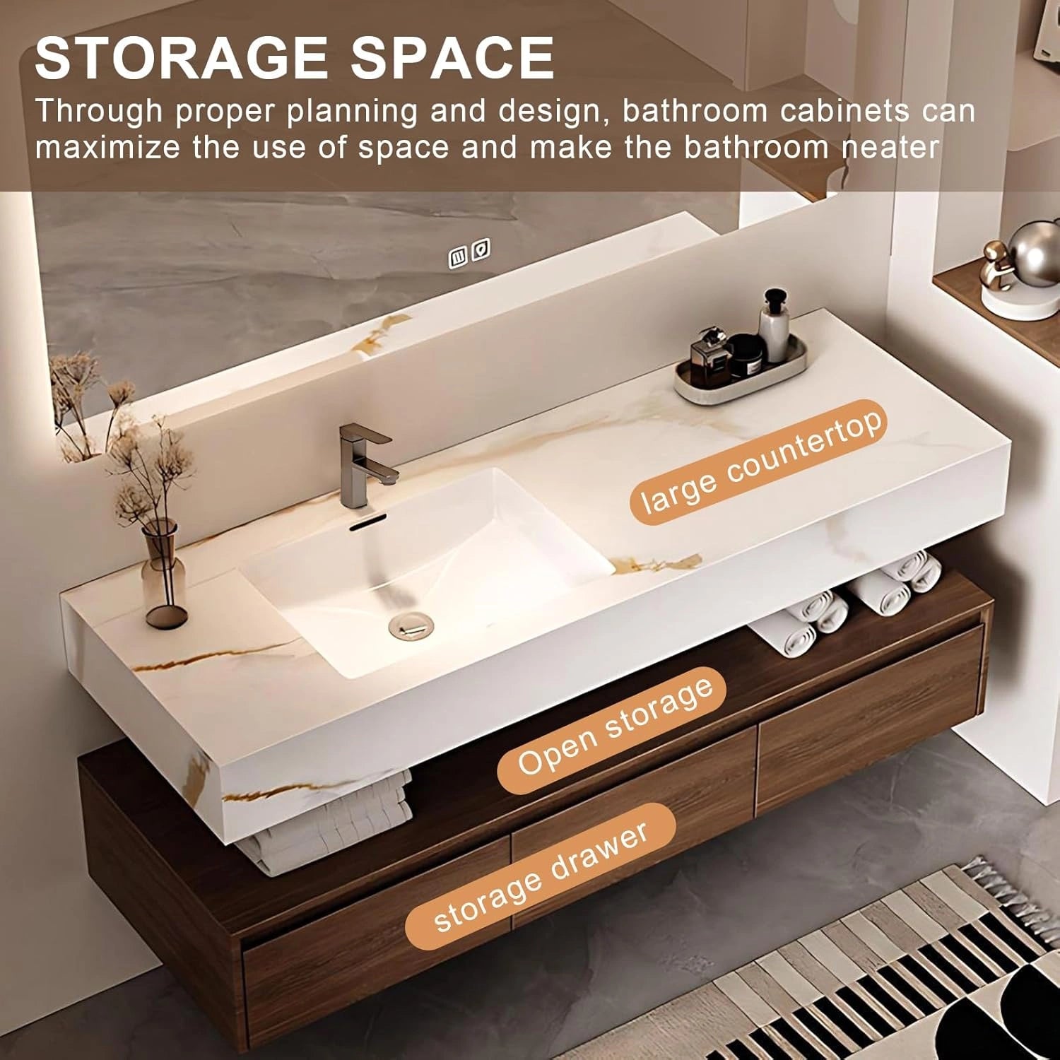 Storage Design: The countertop and cabinet feature a split design to create open storage space; three drawers allow classified storage to keep the bathroom tidy, and the wall-mounted design makes floor cleaning easier.
