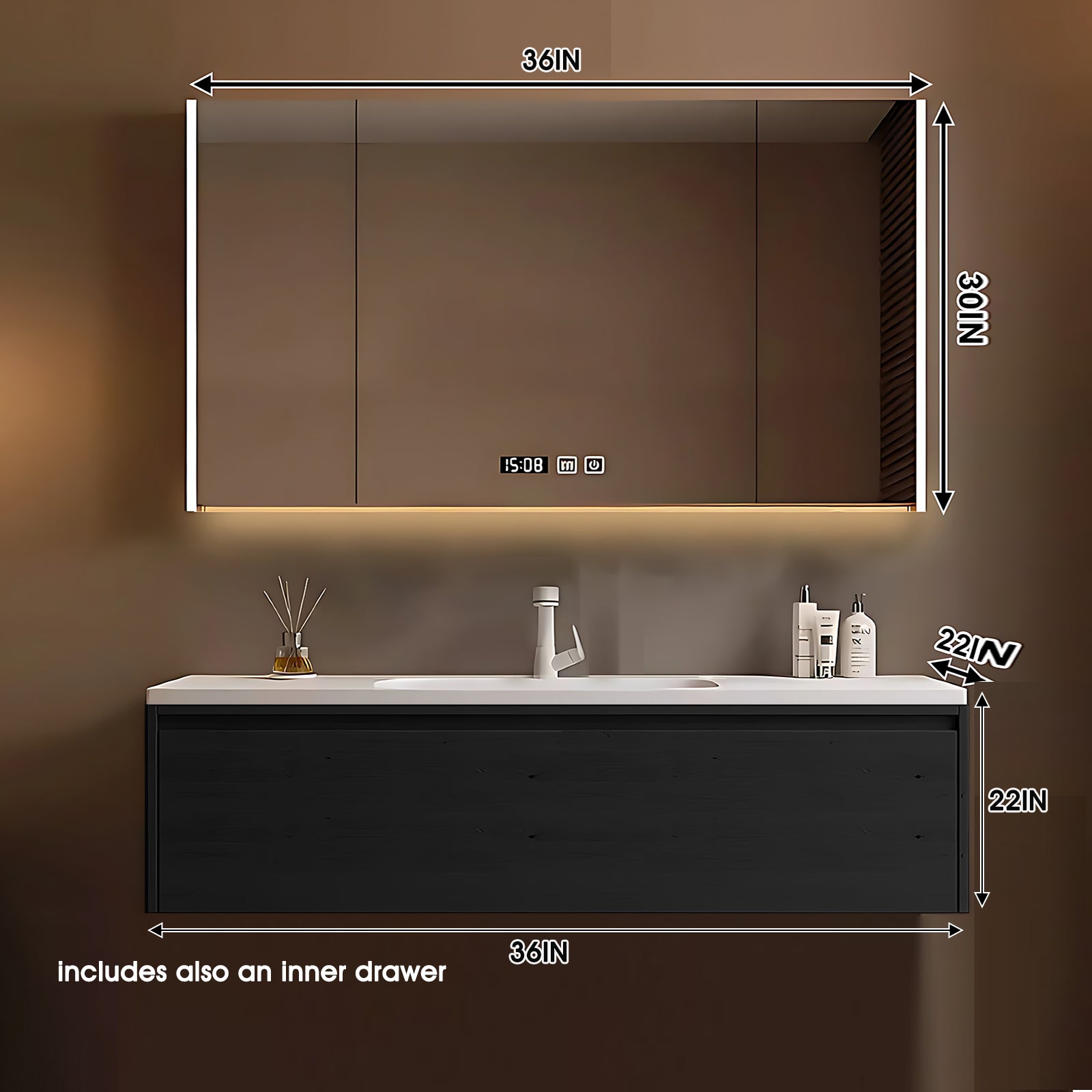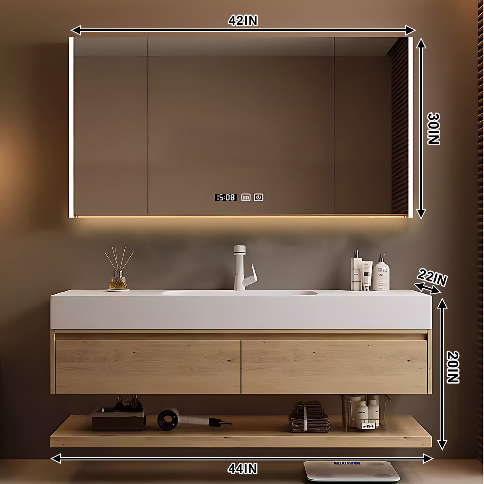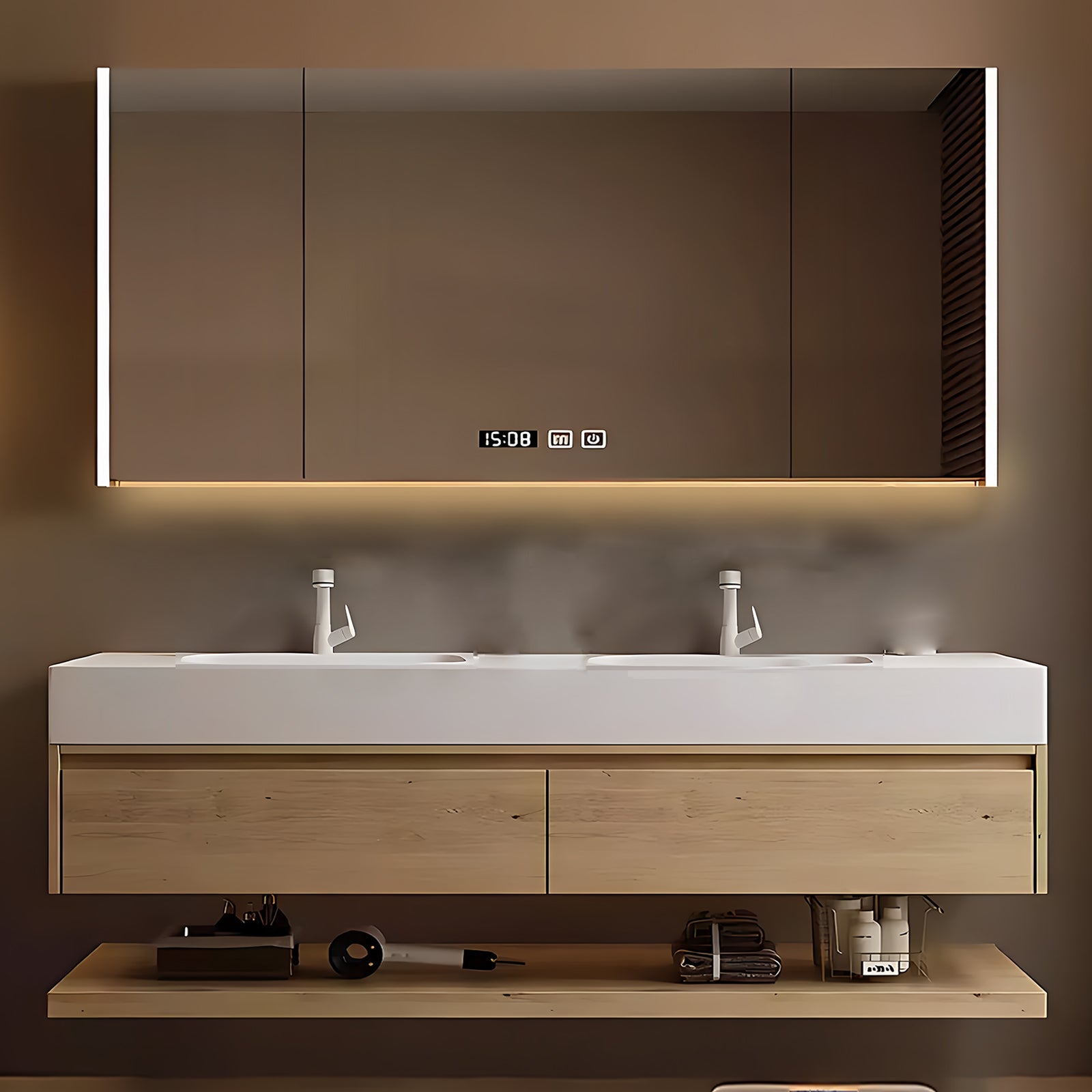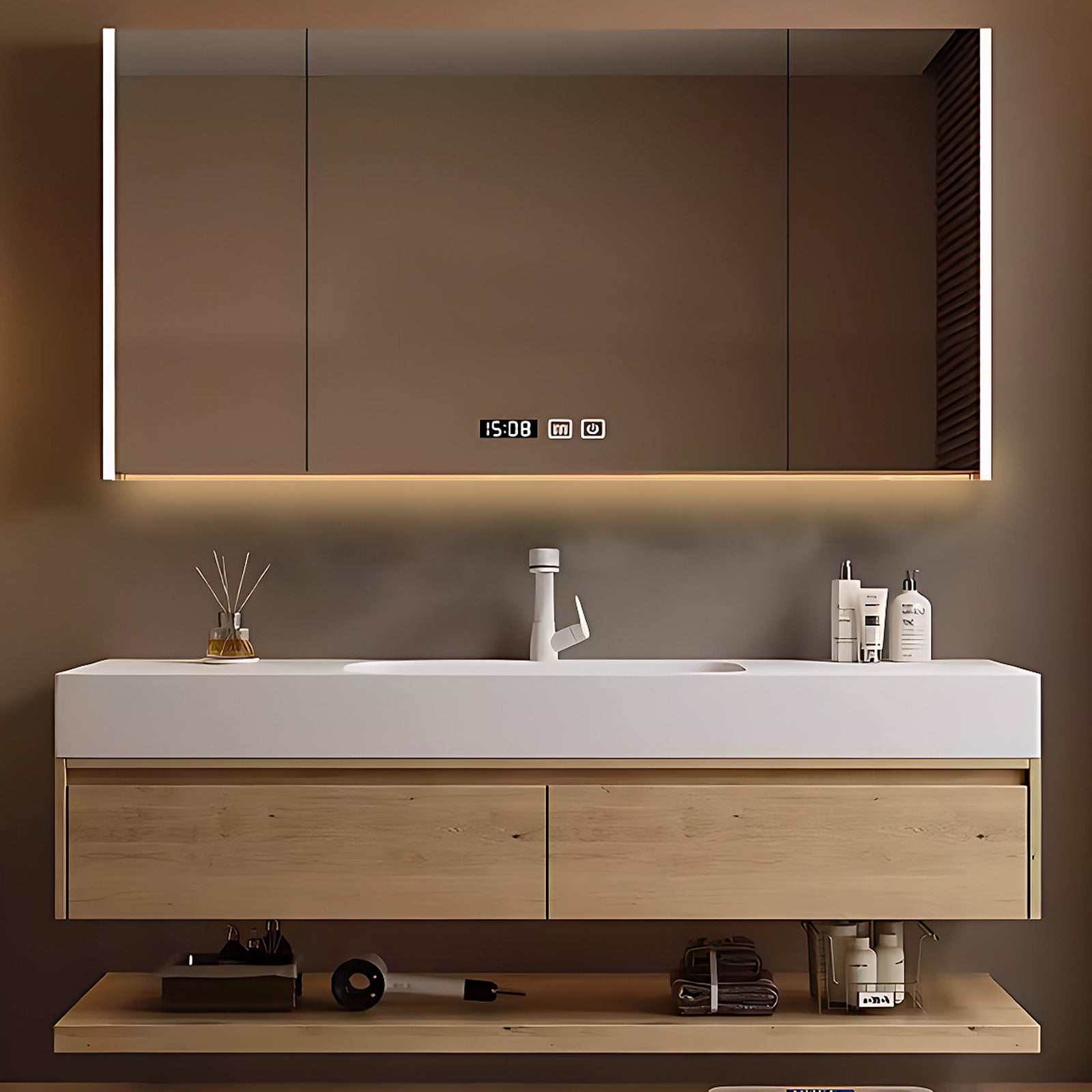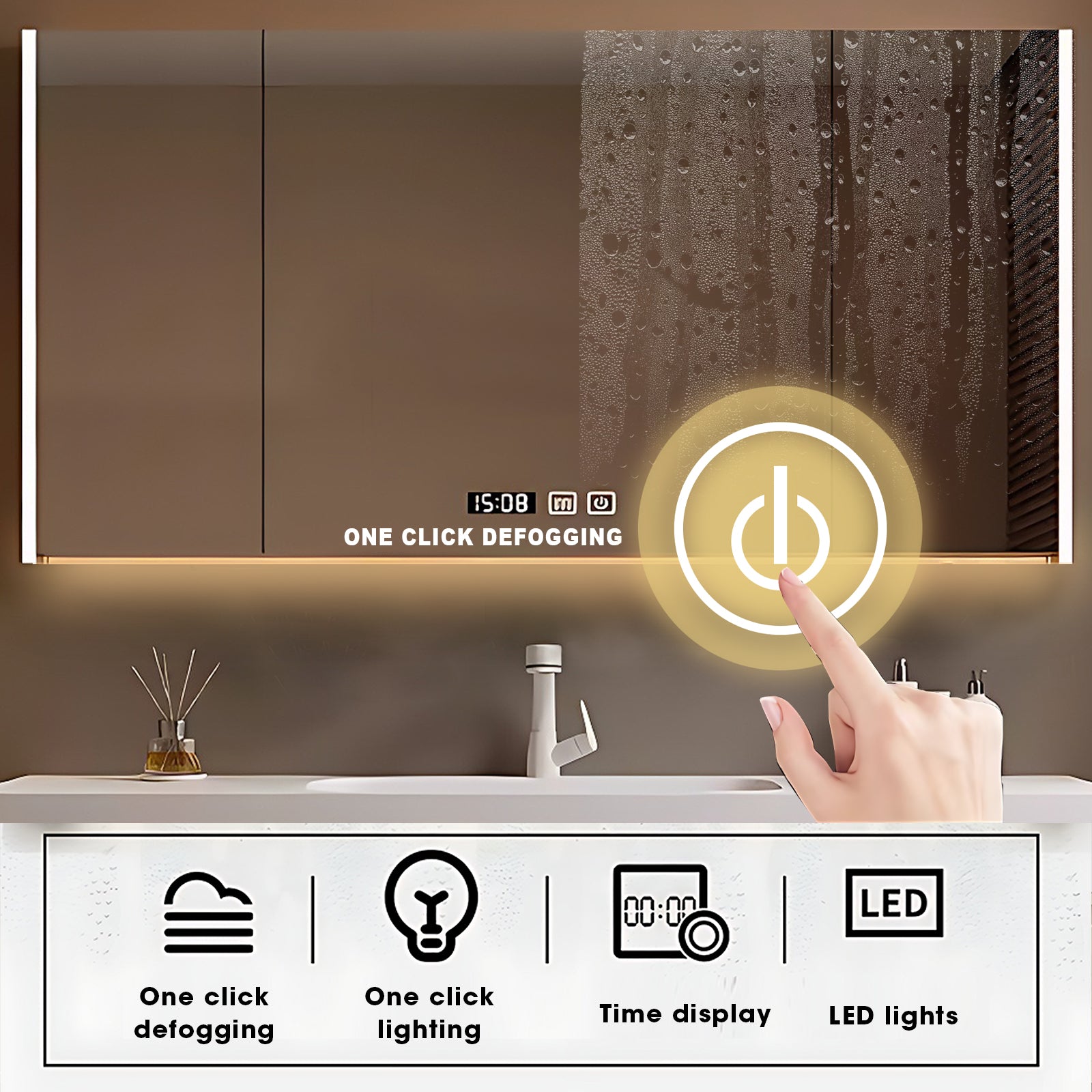 Defog Mirror Cabinet: Experience clarity like never before with our innovative defog mirror cabinet. The one-click defog function ensures that your mirror remains crystal clear, allowing you to admire yourself without any obstructions. Plus, the multi-functional storage rack can provide a dedicated place for hair dryers, cosmetics, toiletries, etc.