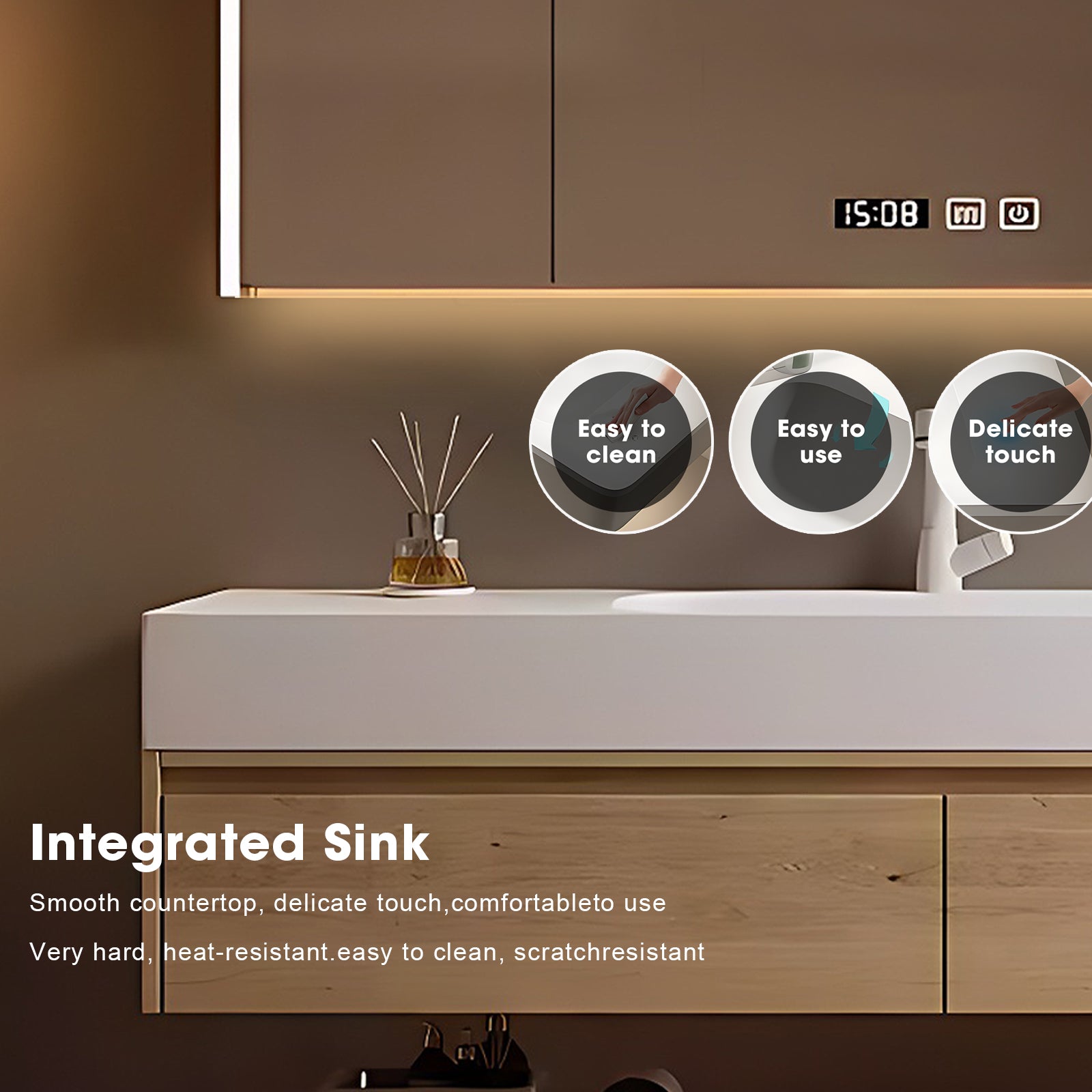 Integrated Sink: Say goodbye to cleaning hassles with our one-piece integrated sink. The seamless white sink seamlessly blends with the wooden aesthetic, elevating the overall elegance of your bathroom while making cleaning a breeze.