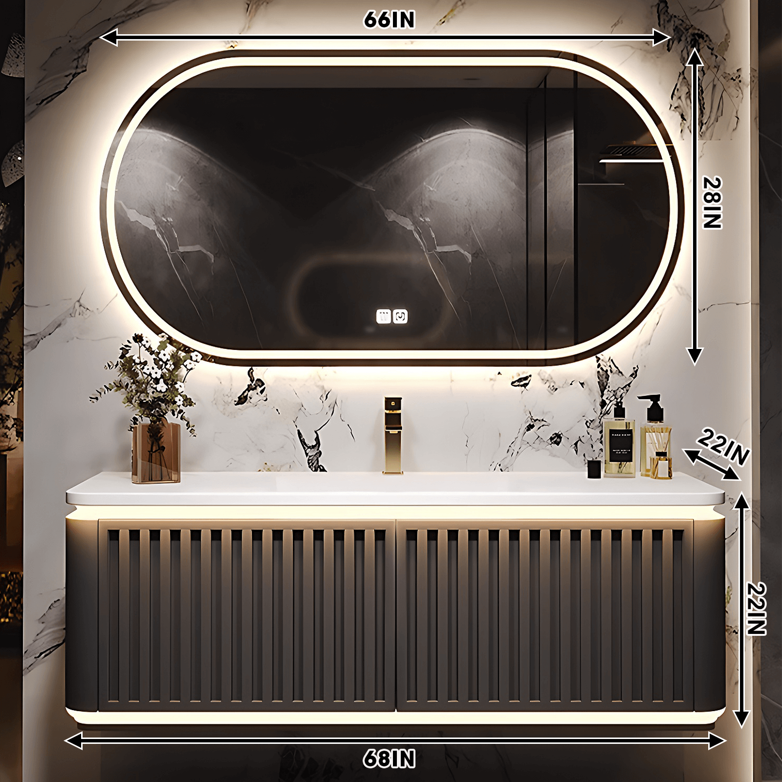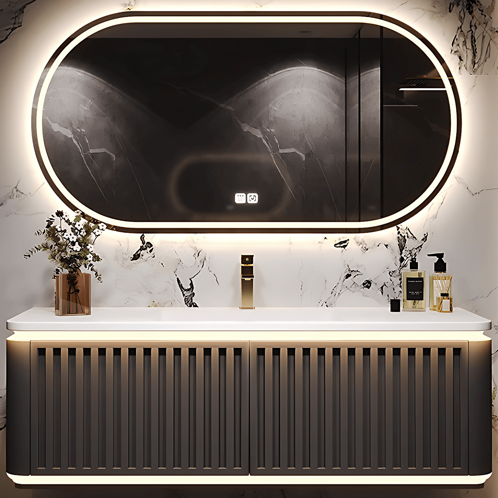 Introducing our Solid Wood Bathroom Vanity Set with Integrated Sink and Smart Mirror. Crafted with meticulous attention to detail, this premium vanity set is designed to elevate your daily routine to new heights of luxury and convenience.