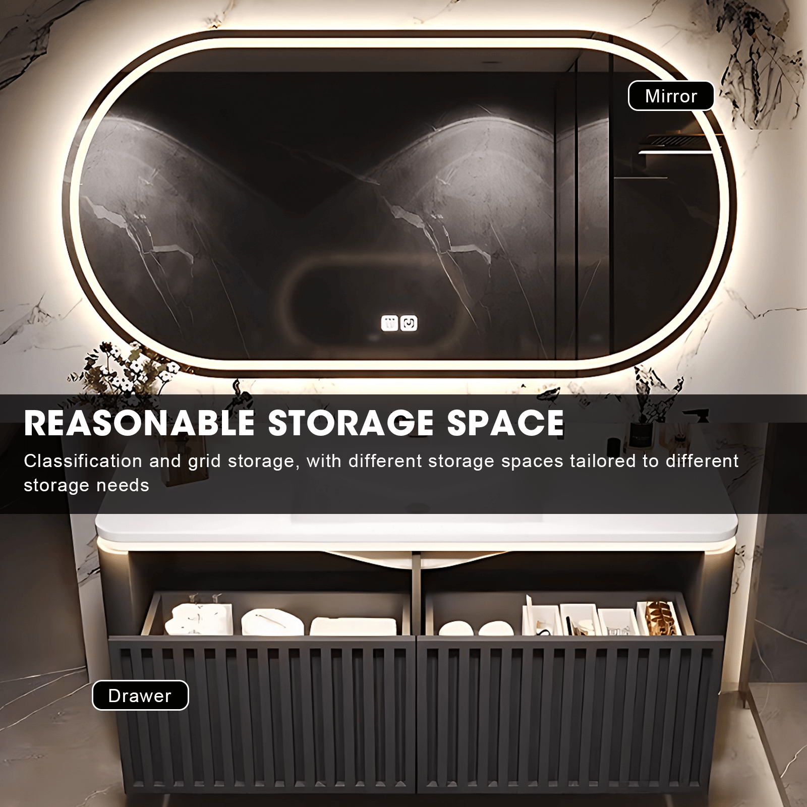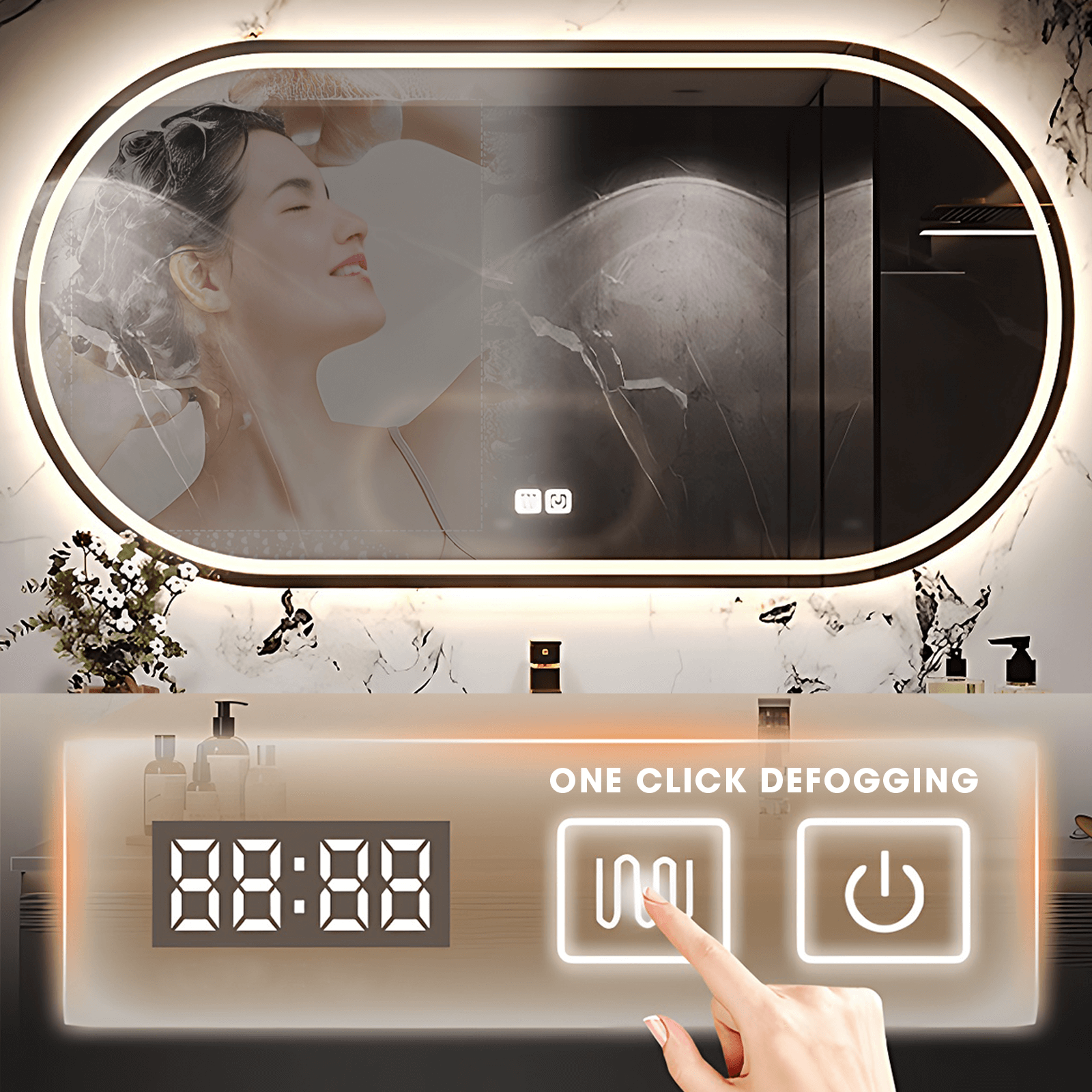 Intelligent Defogger Mirror: Say farewell to foggy mirrors and hello to crystal-clear reflections with our intelligent defogger mirror. Featuring an innovative one-click defogger function, this cutting-edge mirror ensures optimal visibility even in the steamiest of environments. Whether you're shaving, applying makeup, or simply admiring your reflection, our defogger mirror guarantees a flawless experience every time.