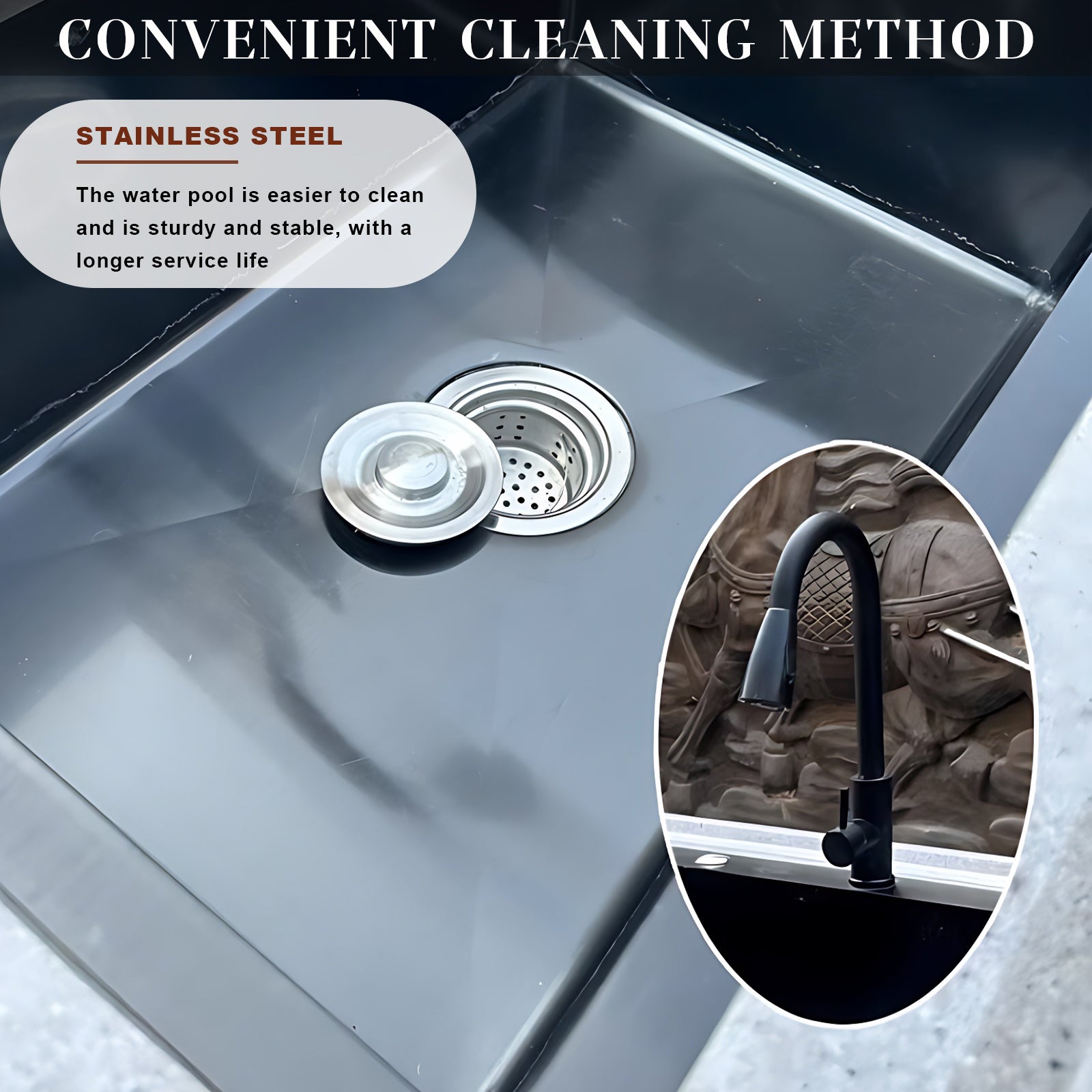 Spacious Storage Space: Our outdoor sink cabinet has ample storage capacity and its extra-wide countertop design allows for easy cleaning, bringing you unparalleled convenience. Inside, there is a spacious, deep and thoughtfully designed elevated storage area with a multi-layer structure that provides an organized and reasonable storage solution. Enjoy the peace of mind that comes with having all your necessities neatly tucked away and easily accessible.