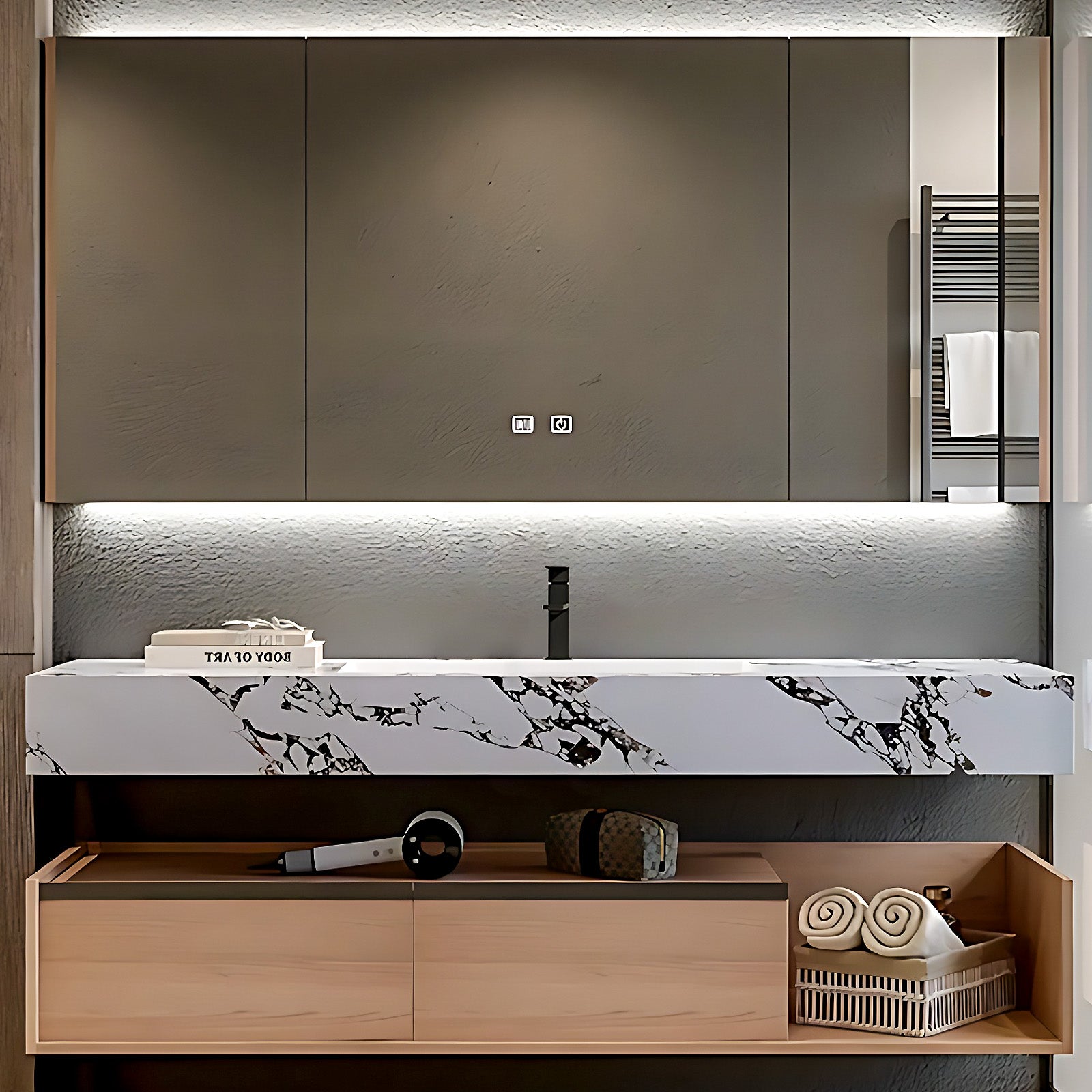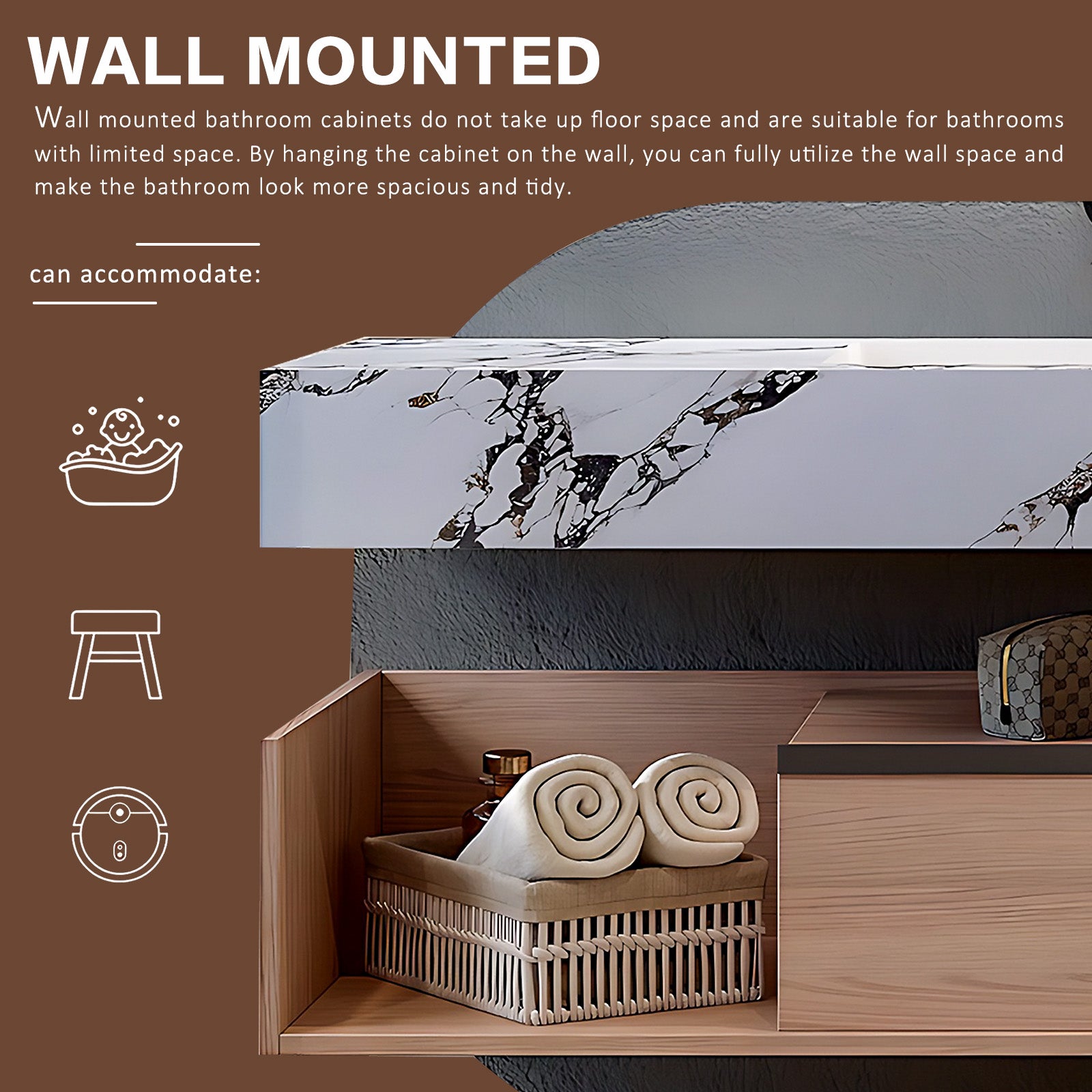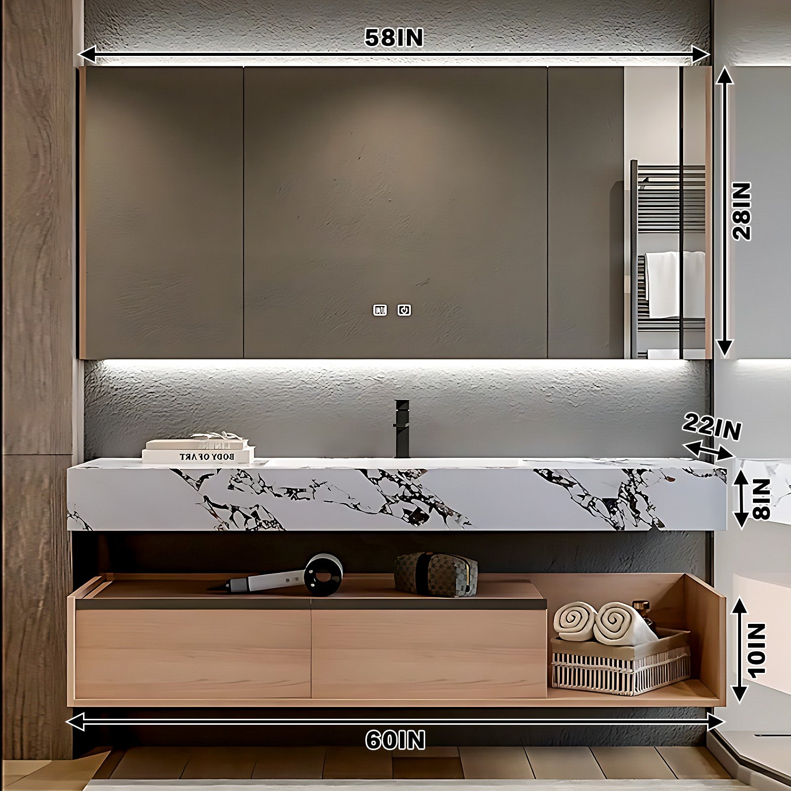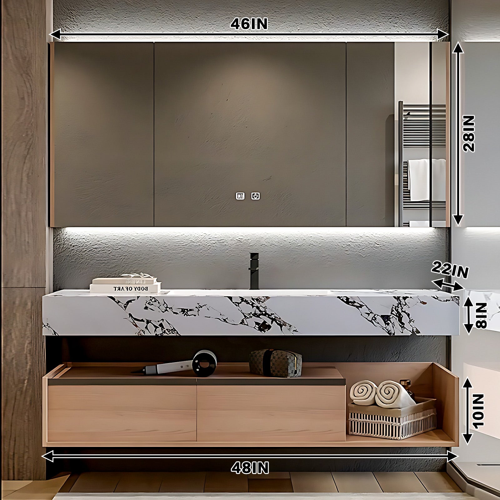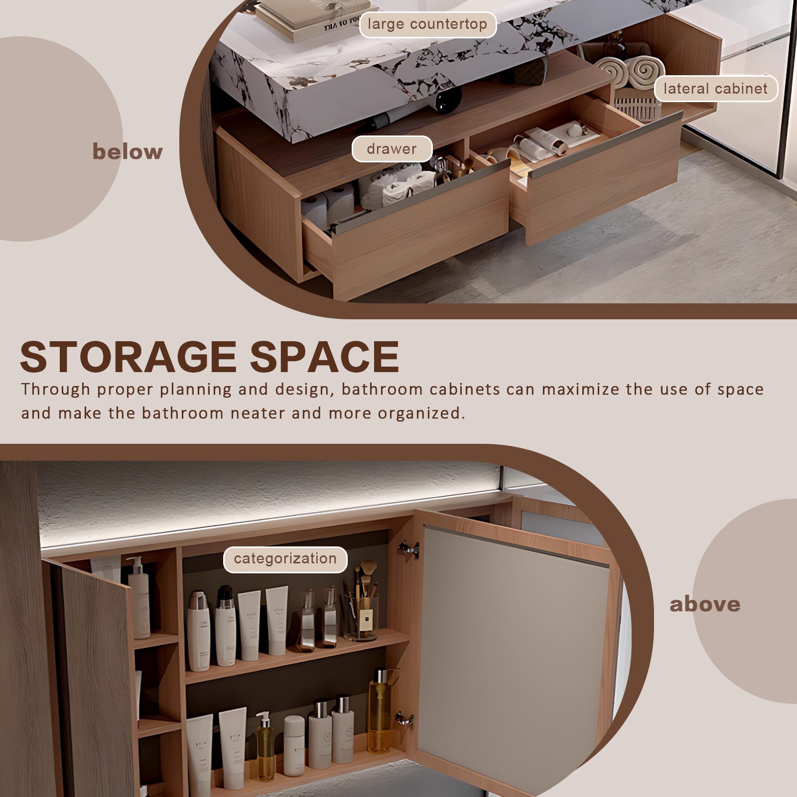 Excellent Aesthetics: Enhance your bathroom with our unique and elegant vanity featuring a sleek wood design that adds luxury and contemporary style. Our vanities feature luxurious marble textured slate tops, complemented by open storage shelves and smart mirror cabinets, creating a captivating visual focal point that enhances the overall beauty of the bathroom. Together they form a cohesive and visually appealing whole that enhances the overall aesthetic of the bathroom.