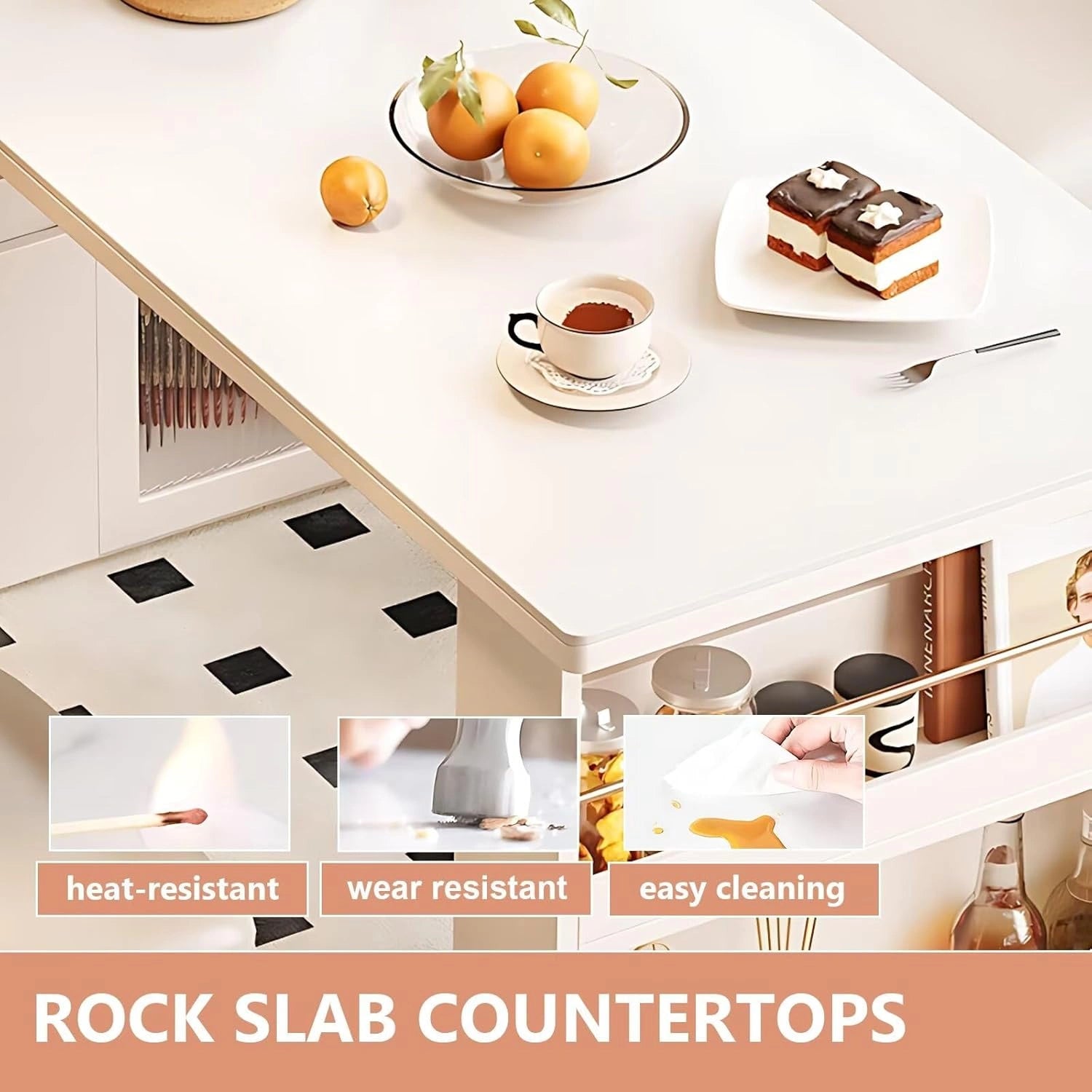 Light Luxury Style: This integrated kitchen island and tabletop features a fresh white finish and delicate design. The tabletop can be rotated 180 degrees, allowing you to place it freely, while the glass doors add a delicate and stunning touch.