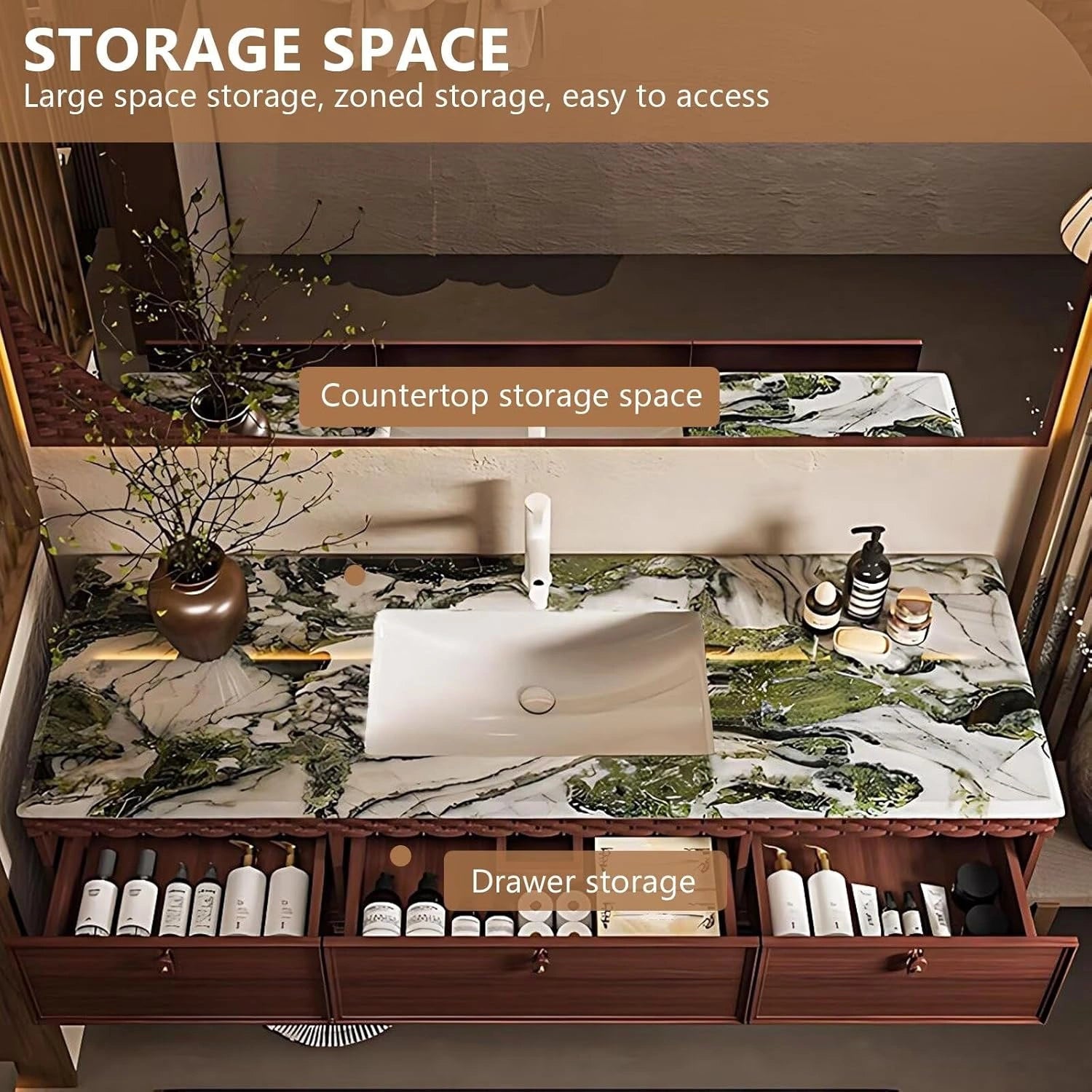 Medieval Style: The overall design features retro and elegant lines, with a simple square solid wood cabinet body. The surface is adorned with retro woven elements, paired with an arc-integrated mirror decoration, making it suitable for various bathroom styles.
