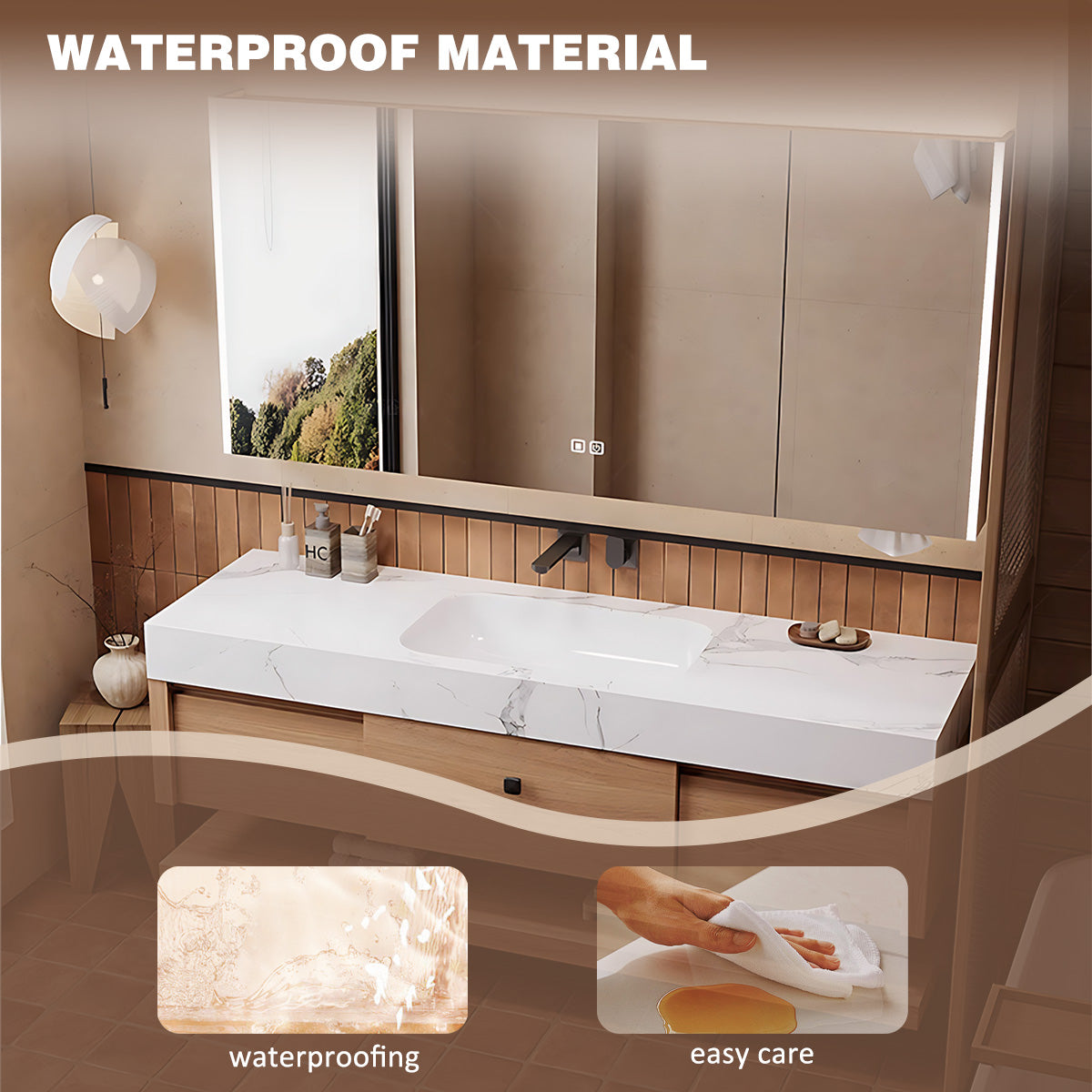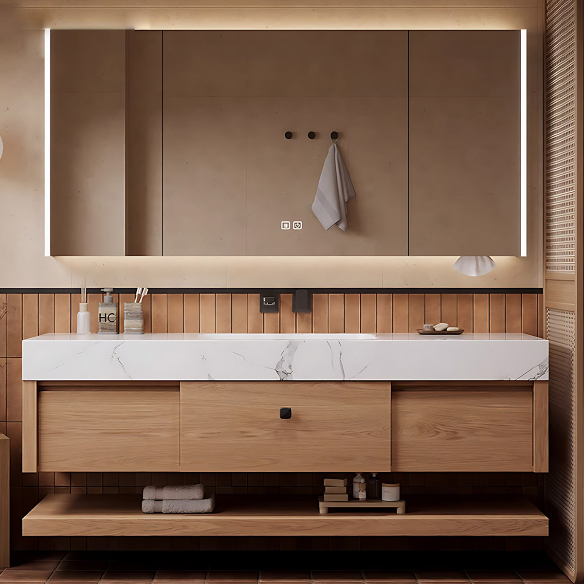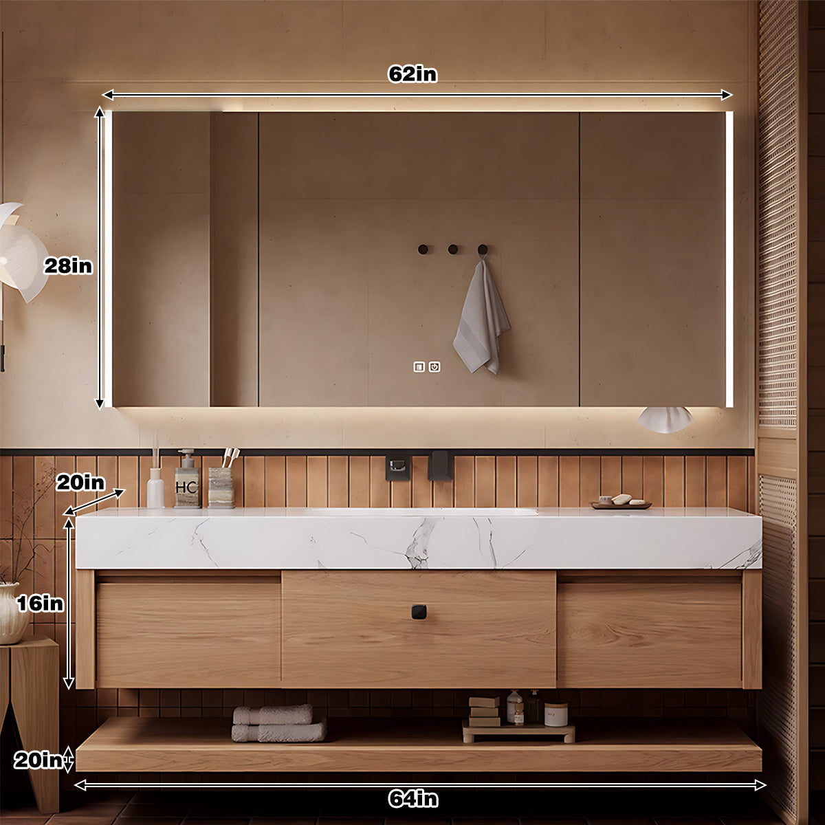 Open Storage Medicine Cabinet Convenience: Experience unparalleled convenience with the open storage medicine cabinet. This feature not only provides easy access to your essentials but also adds a contemporary flair to the vanity set, offering a dedicated space for your frequently used items.