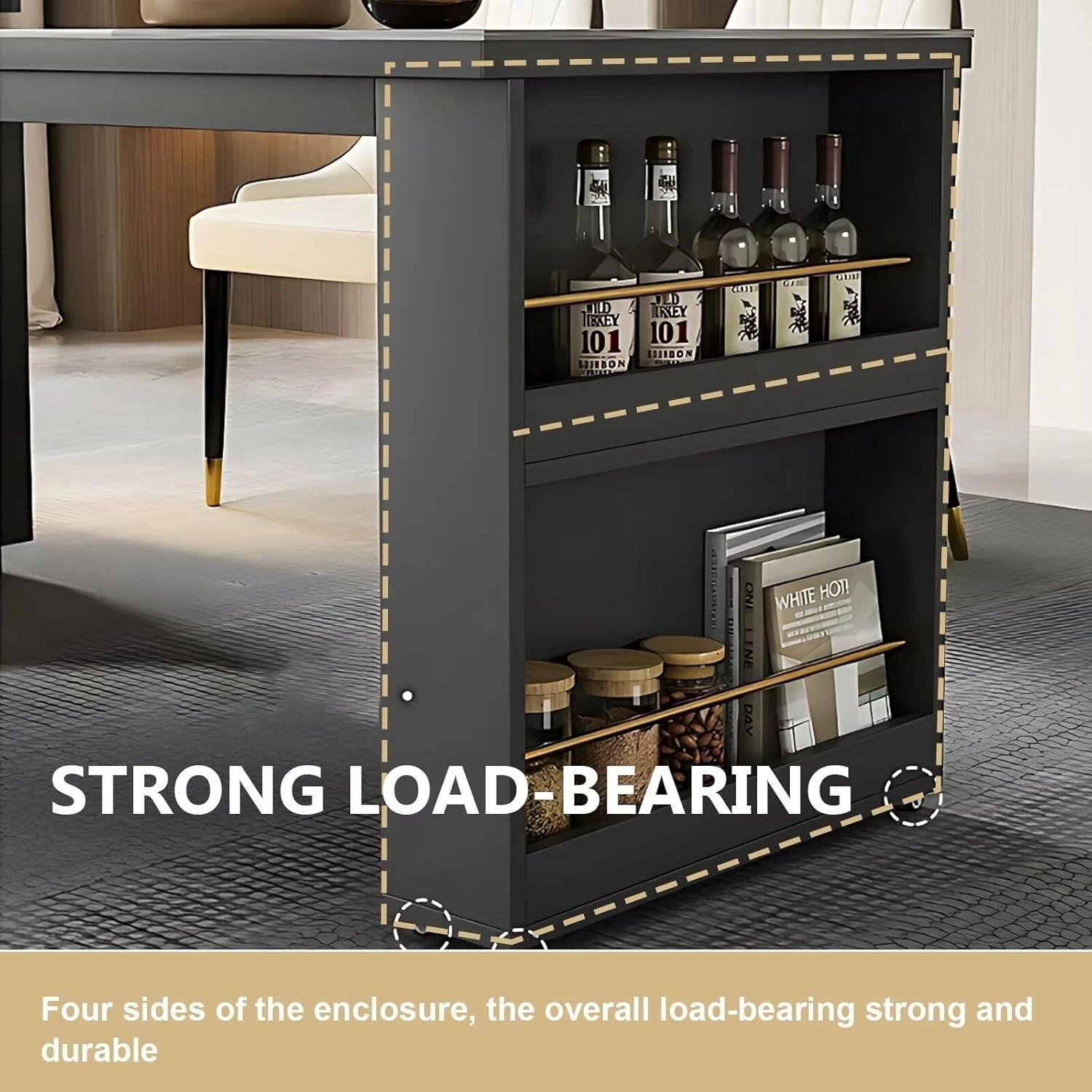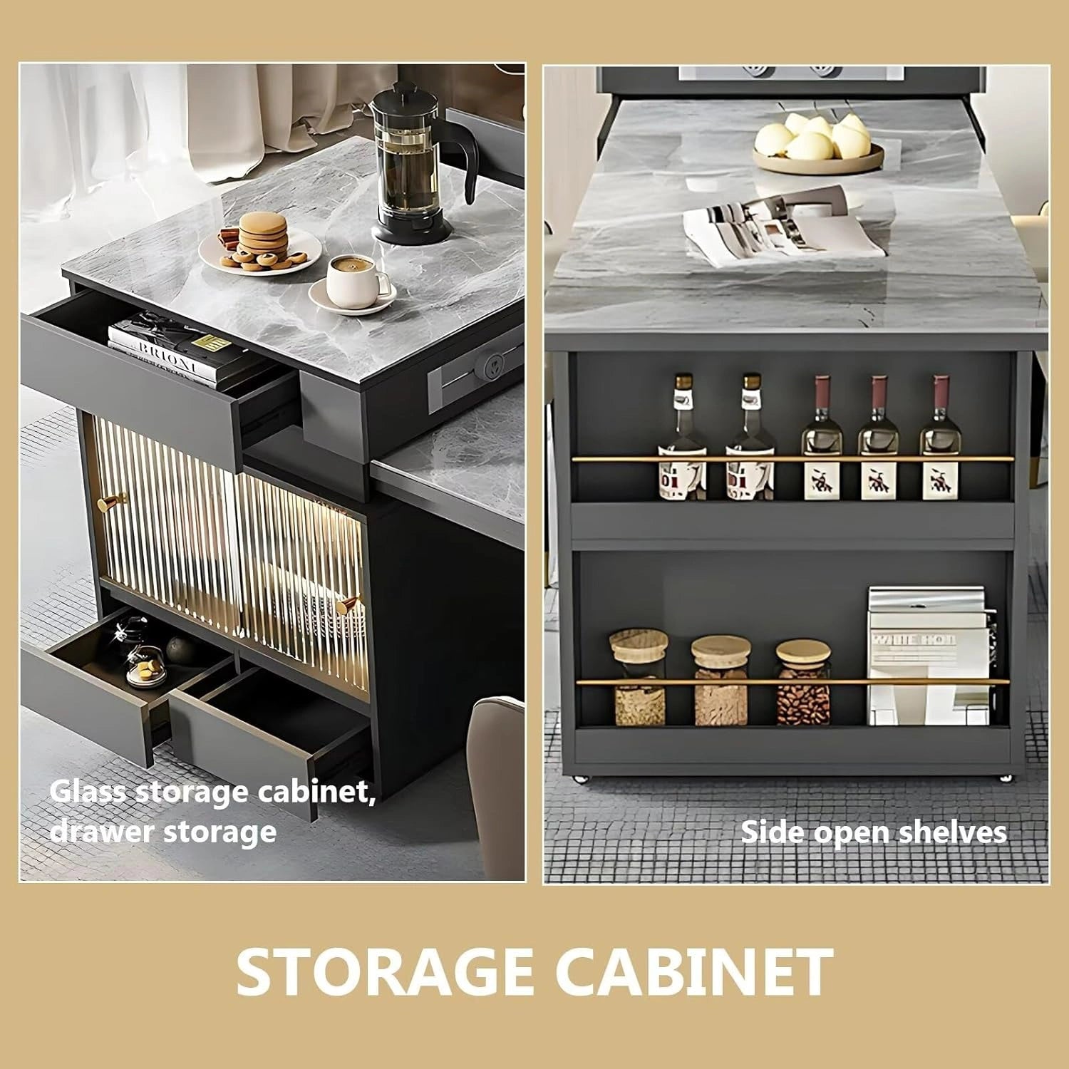 Ample Storage Space: The island cabinet features a glass-door compartment, perfect for storing tea sets, tableware, and other essentials. Meanwhile, the open storage shelves built into the table legs provide convenient access to your frequently used items.