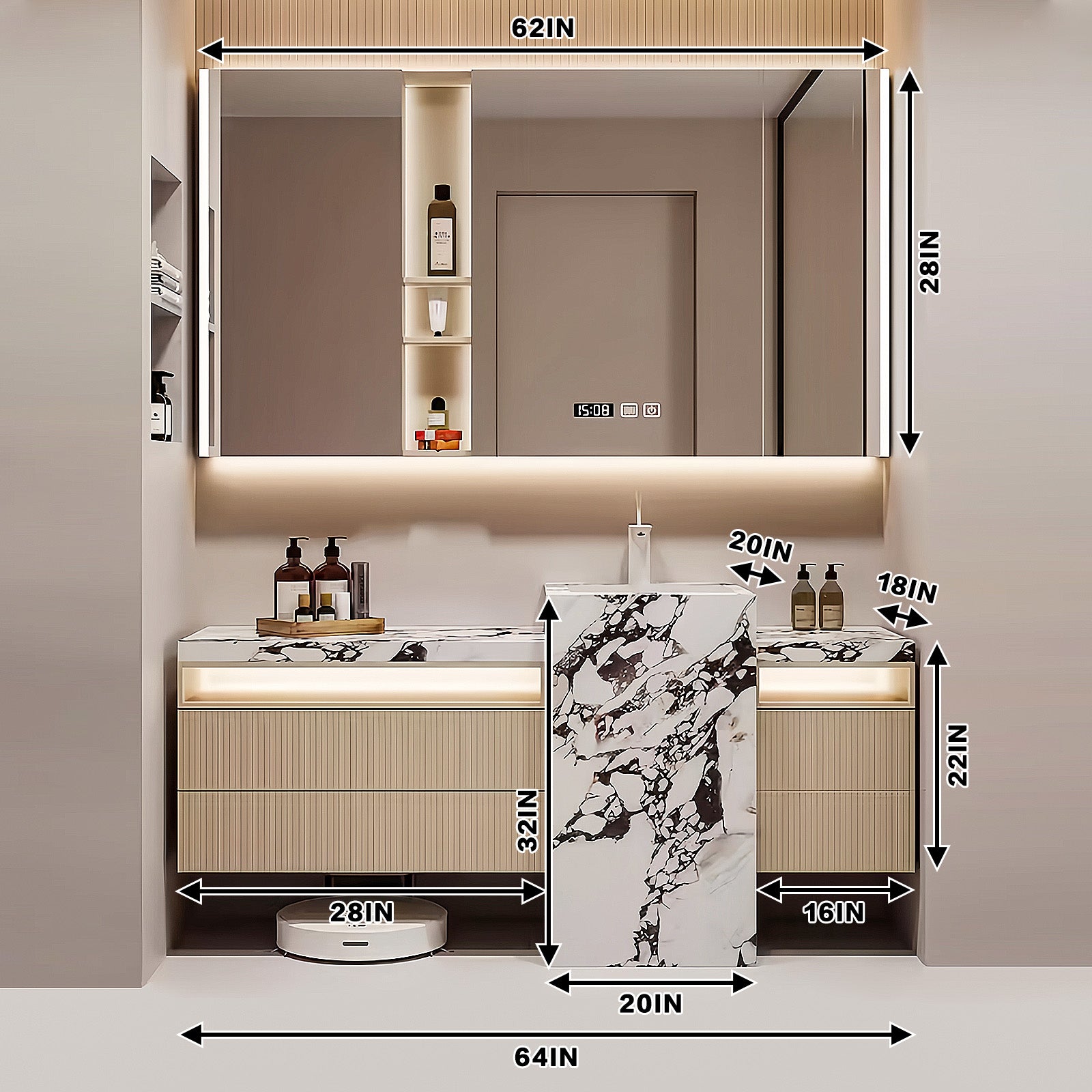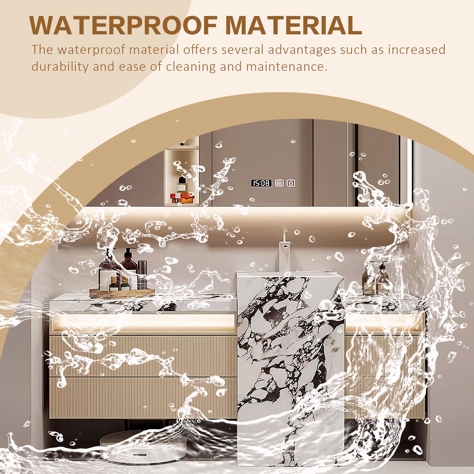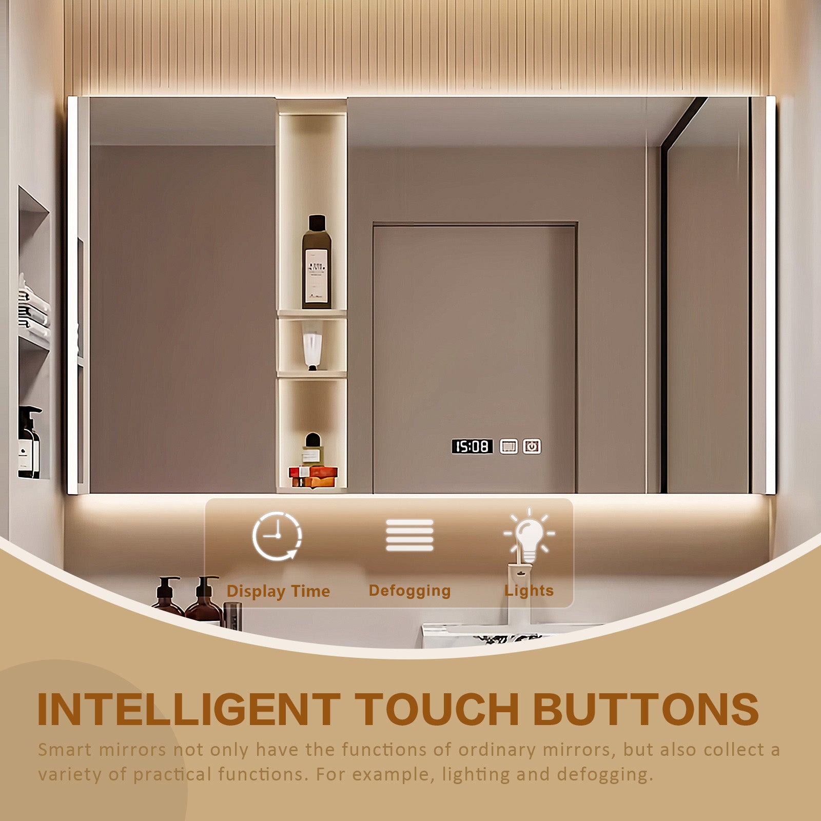 Smart Time Display Mirror: Simplify your mornings with our smart mirror, which features one-touch defog and built-in lighting for enhanced illumination. Its smart design ensures you don't miss a detail, while the sophisticated hardware adds a luxurious touch to your bathroom aesthetic. It also has a time display, which makes it easier to manage time.