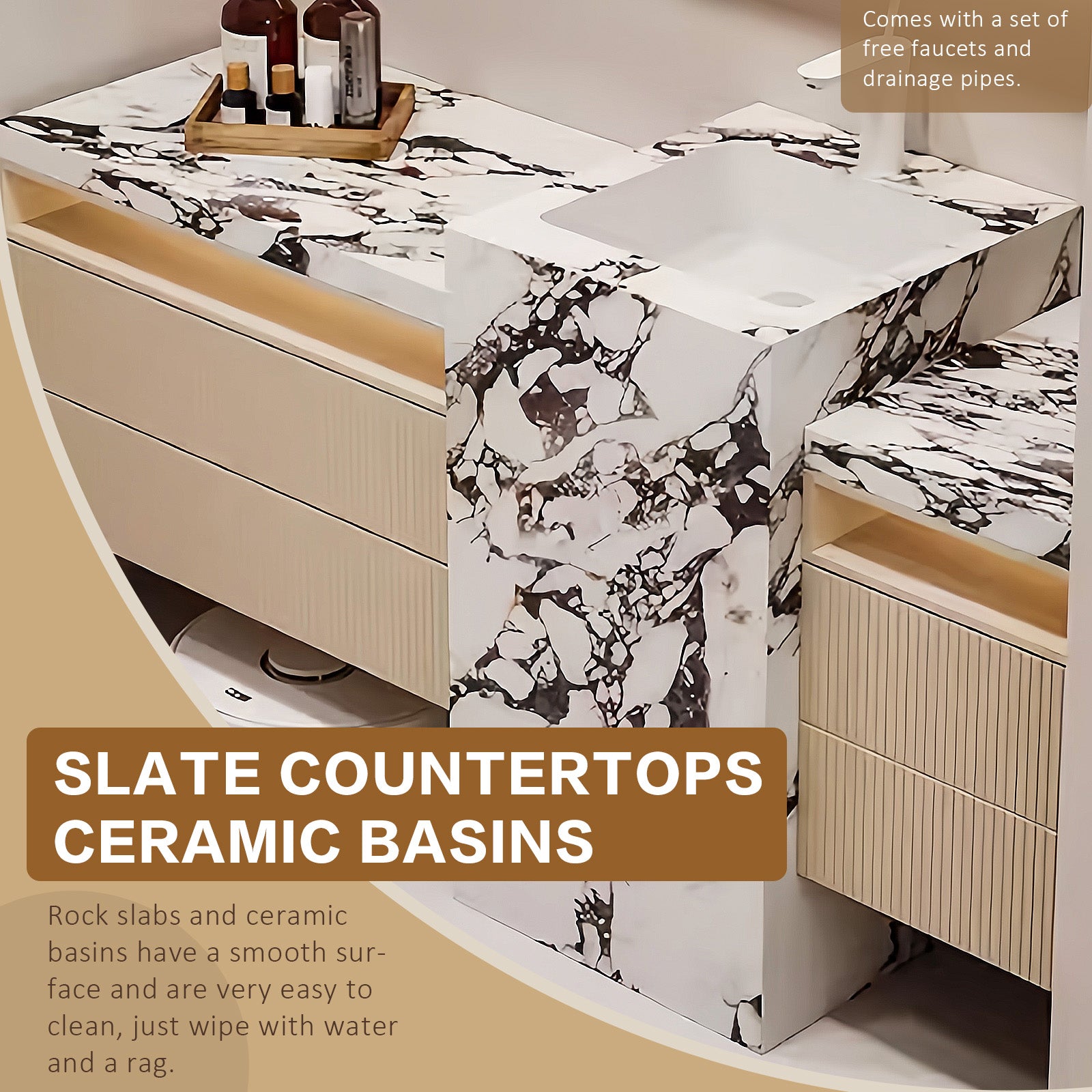 A Fusion of Design Elements: Experience the epitome of sophistication and functionality with our carefully crafted bathroom cabinets. Seamlessly blending design elements, every detail is thoughtfully considered to enhance your space. Our cabinets feature a stunning striped wavy panel drawer design, complemented by a uniquely patterned slate sink and ceramic basin. These elements are paired with a stylish square mirror to form a harmonious whole that enhances the beauty of the bathroom.