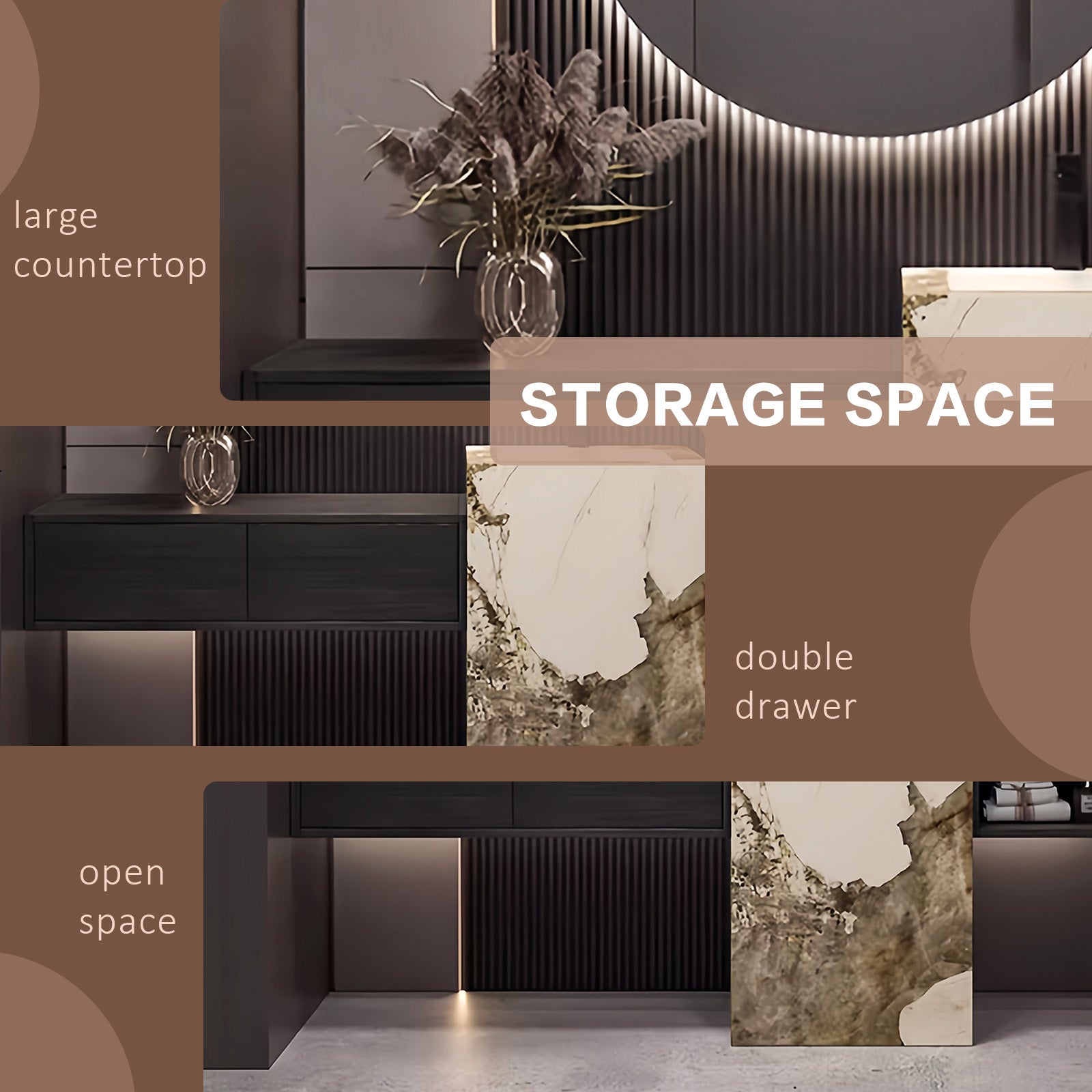 Efficient Storage Space: Experience unparalleled storage capacity with our thoughtfully designed vanities. Built-in oversized drawers and open shelving provide ample space to organize toiletries, towels and daily essentials, transforming your bathroom into a haven of organization and luxury. Enjoy customizable storage options tailored to your daily routine, all within easy reach thanks to the hanging design that keeps toiletries neatly in place.