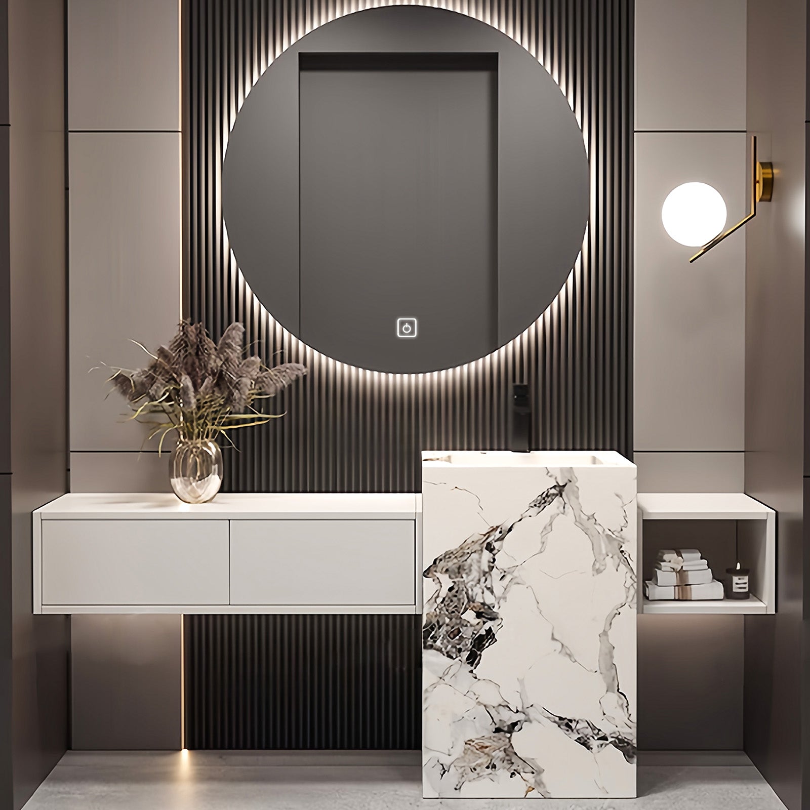 Smart Round Mirror: Enhance your beauty experience with our smart round mirror. Carefully crafted with high-definition smart floating silver mirror and LED soft light, the lighting is clear and bright with one click. Say goodbye to backlight issues because this mirror provides even light reflection and realistic colors, allowing you to apply makeup with precision and reflect your true self more clearly.We give away faucets and drain pipes.