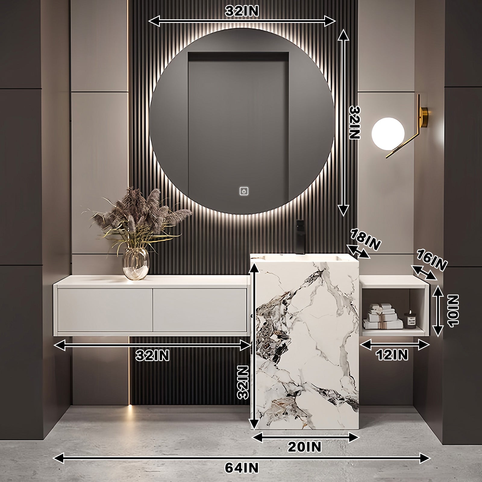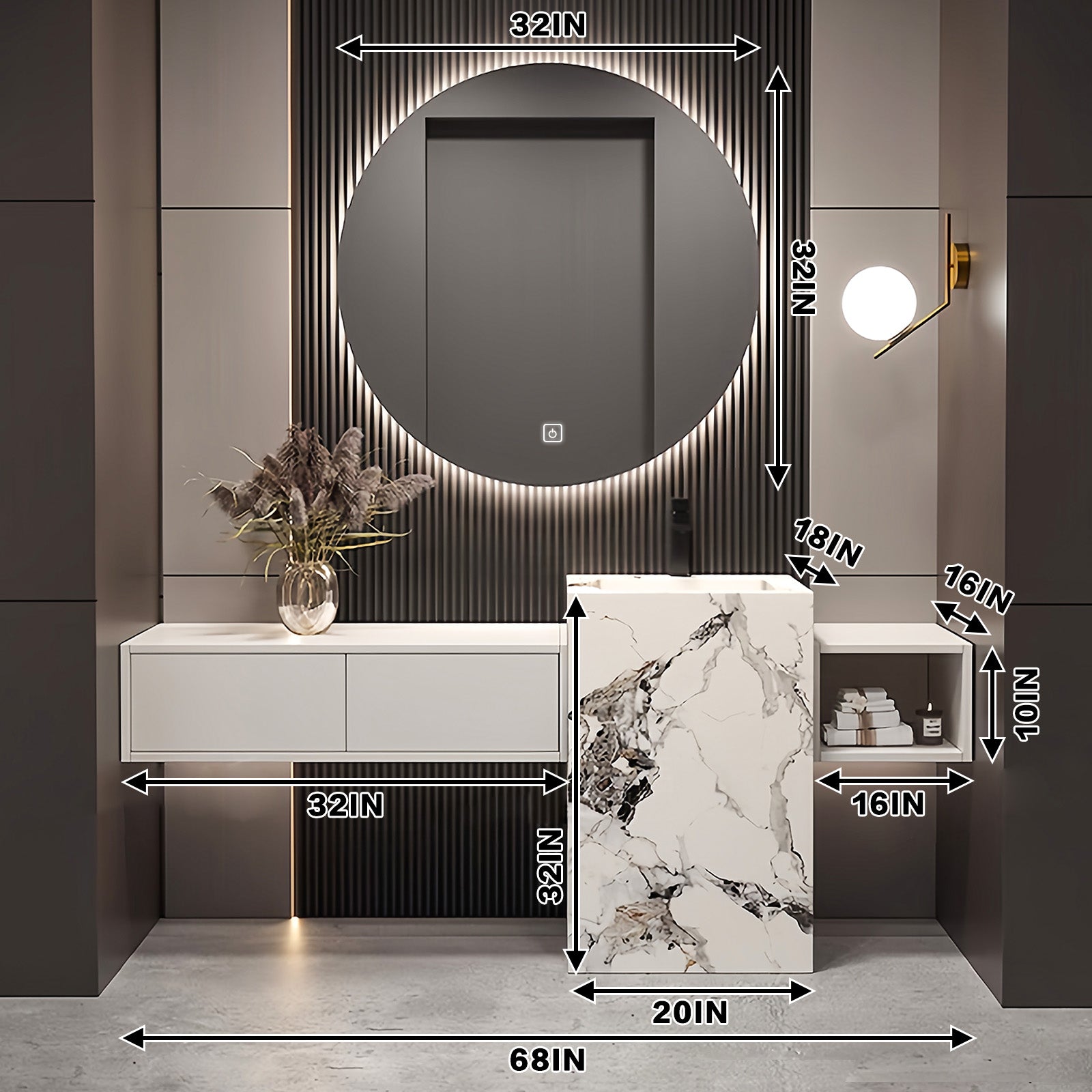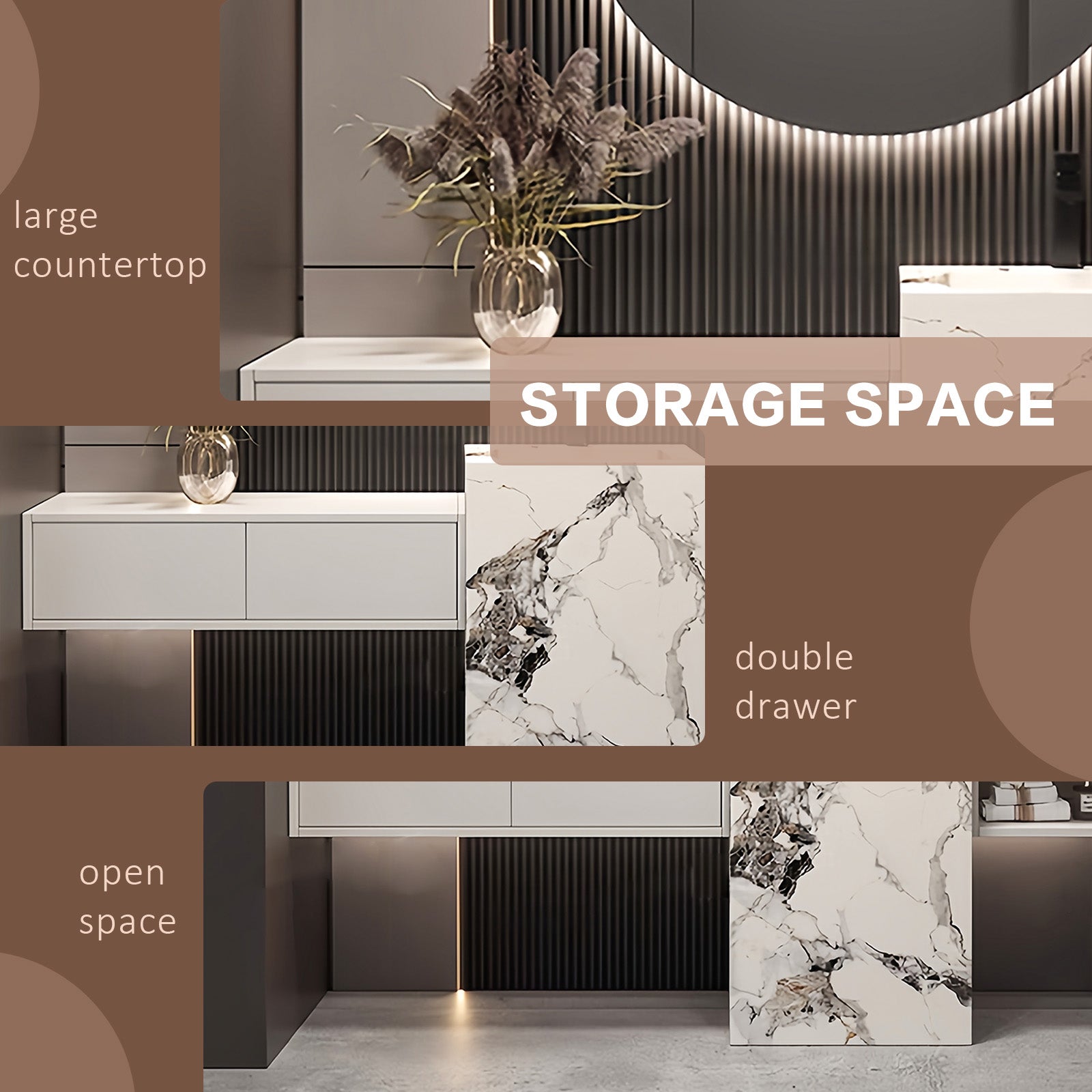 Efficient Storage Space: Experience unparalleled storage capacity with our thoughtfully designed vanities. Built-in oversized drawers and open shelving provide ample space to organize toiletries, towels and daily essentials, transforming your bathroom into a haven of organization and luxury. Enjoy customizable storage options tailored to your daily routine, all within easy reach thanks to the hanging design that keeps toiletries neatly in place.