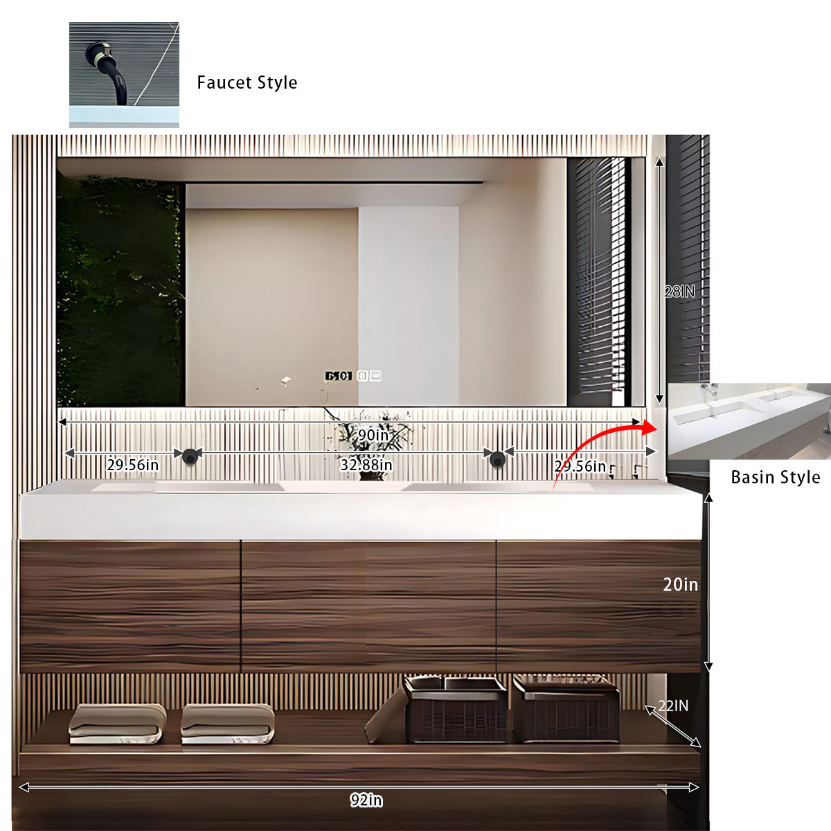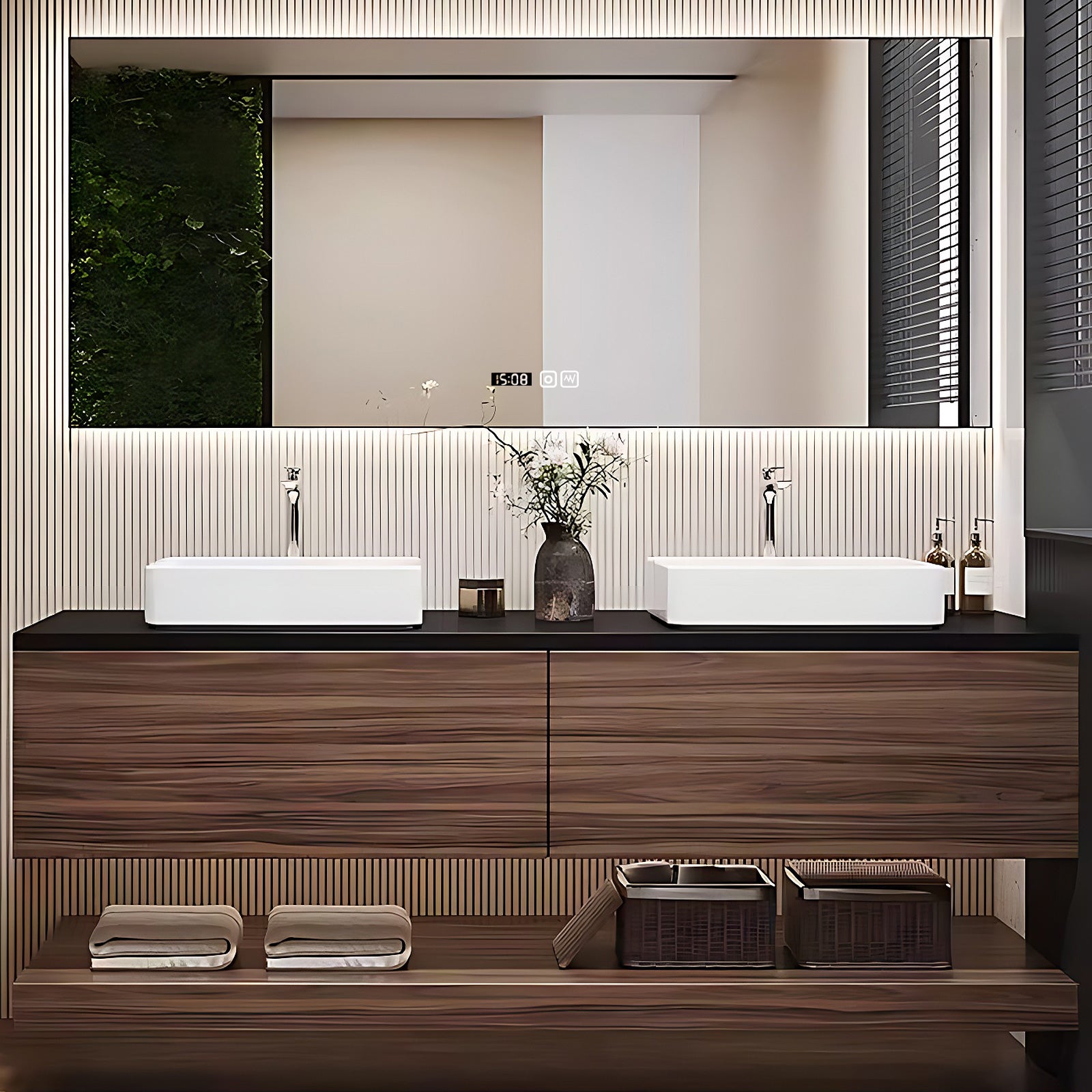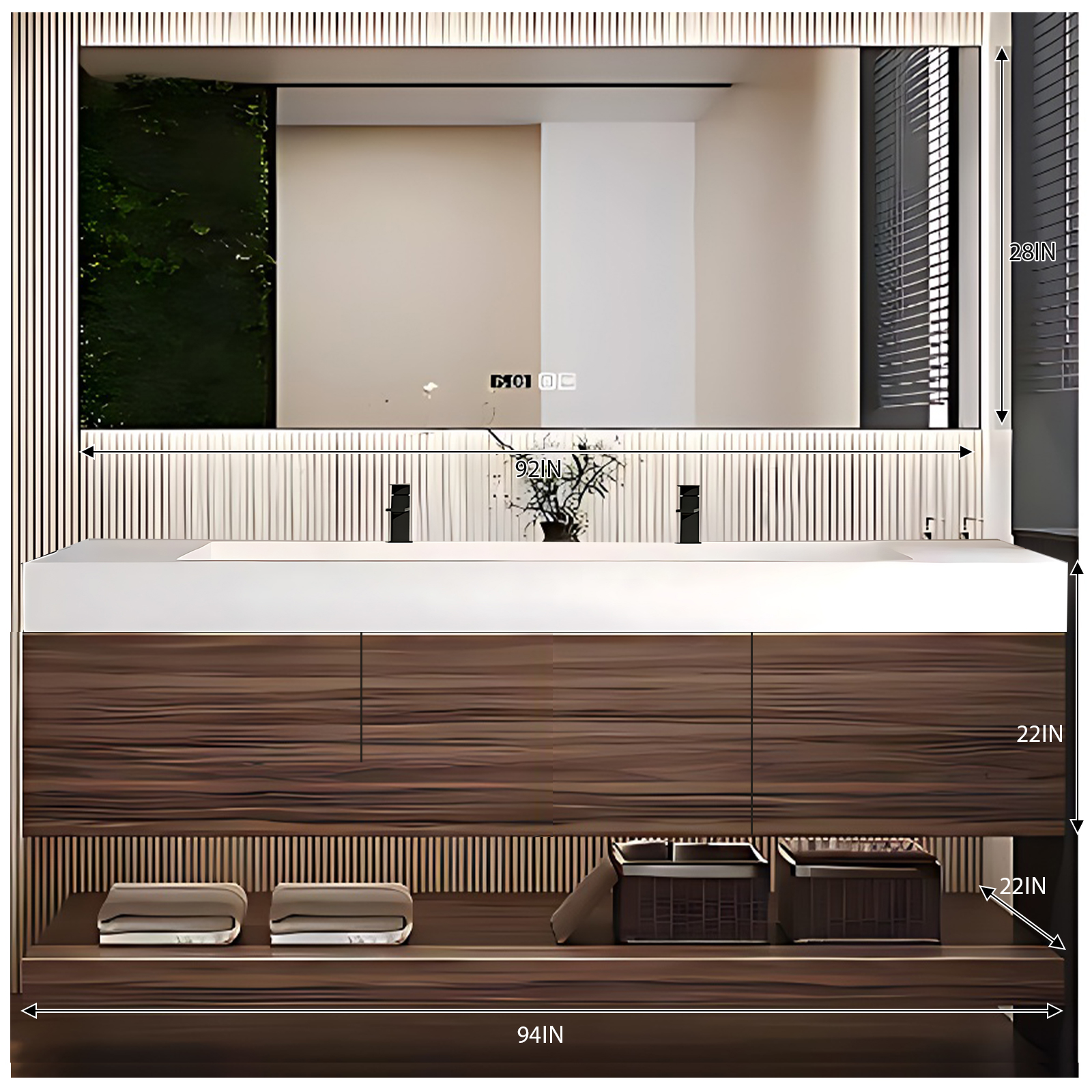 This premium wall-mounted bathroom vanity set offers a perfect combination of modern design, smart technology, and practical functionality. Its elegant and minimalist look makes it an ideal choice for a contemporary bathroom, while the smart mirror and double ceramic sinks add luxury and convenience to your daily routines.