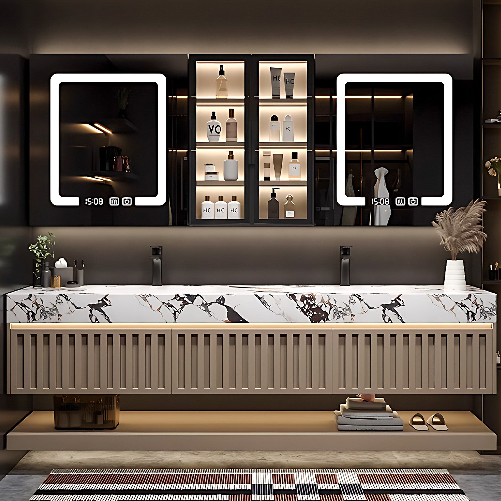 Double Sinks Design: Experience convenience and luxury like never before with our thoughtfully designed dual sink and dual faucet designs. Designed to suit the diverse needs of your entire home, our seamlessly integrated double sinks and high-quality taps ensure smooth, uninterrupted water flow and say goodbye to waiting in queues. Immerse yourself in sophistication with our dual smart mirrors, designed to illuminate your beauty with unparalleled clarity and elegance.