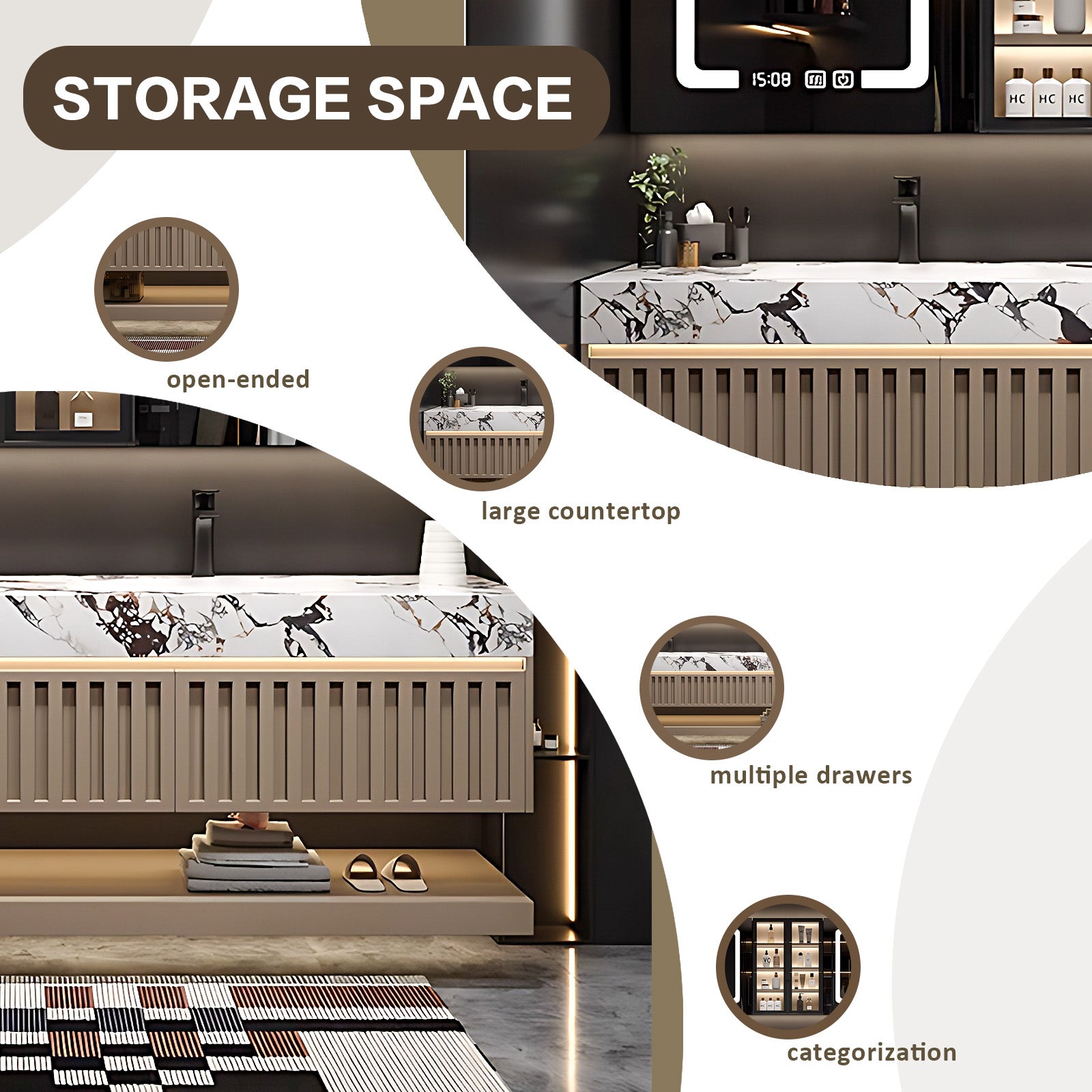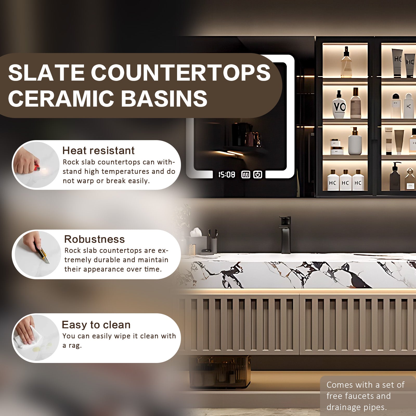 Modern Unique Design: Our avant-garde bathroom collections offer an unprecedented blend of luxury and simplicity for an extraordinary experience. Our meticulous attention to detail transcends traditional boundaries to provide you with a dynamic and unforgettable experience. Created with keen creativity, our striped drawer fronts feature rich coffee tones that complement our stylish slate tops with stunning marble veining.