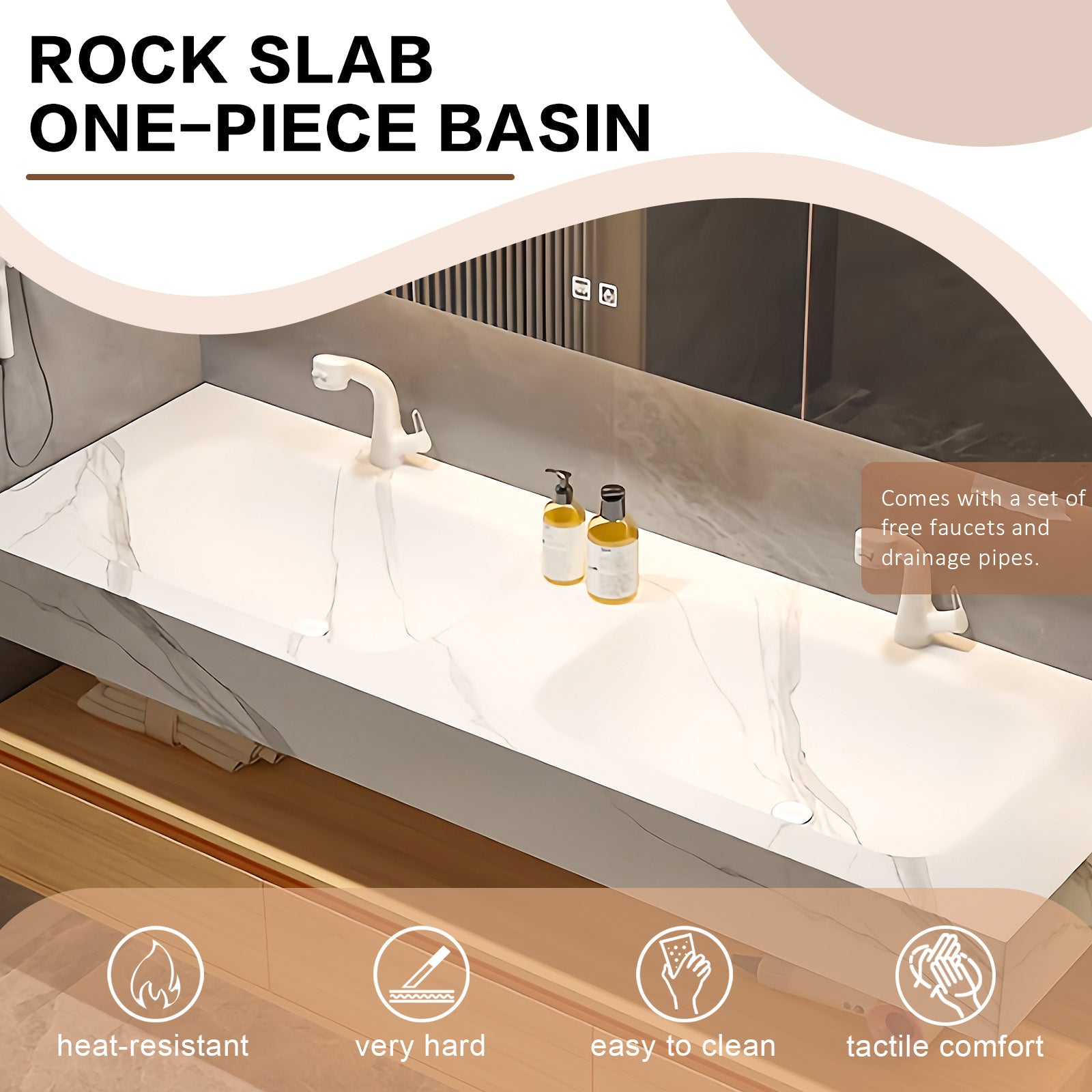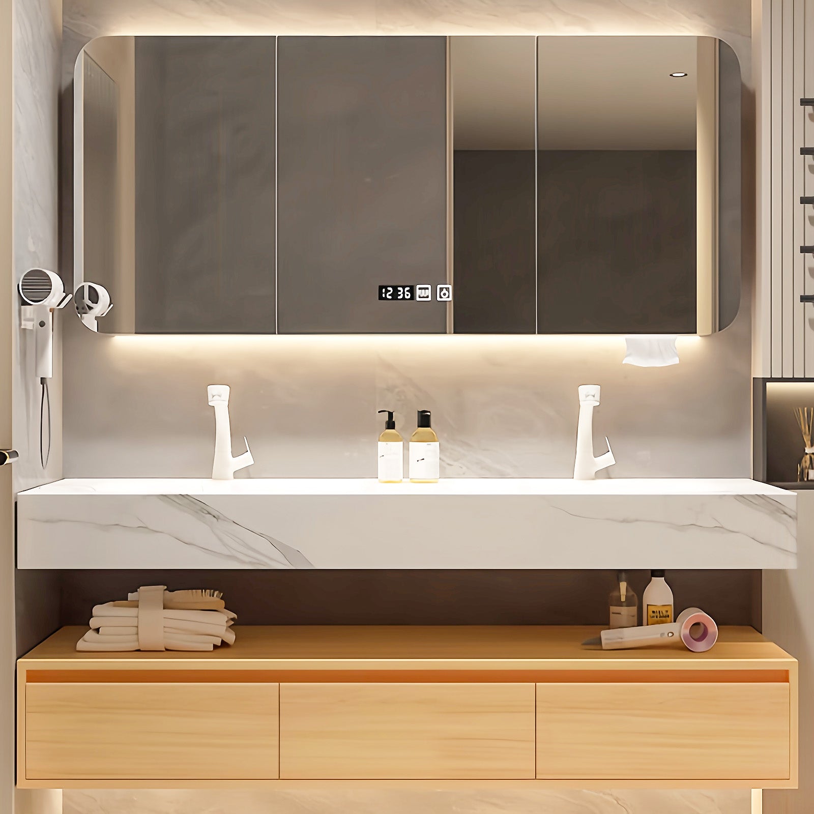 Efficient Organization: Our vanity features an innovative three-tier storage layout to enhance your bathroom storage layout. A smart mirror with integrated storage provides seamless organization for your daily bath products, while extra drawers and open storage shelves under the sink provide extra practicality. The hanging lower section ensures easy access to essentials, increasing convenience and simplifying cleaning.
