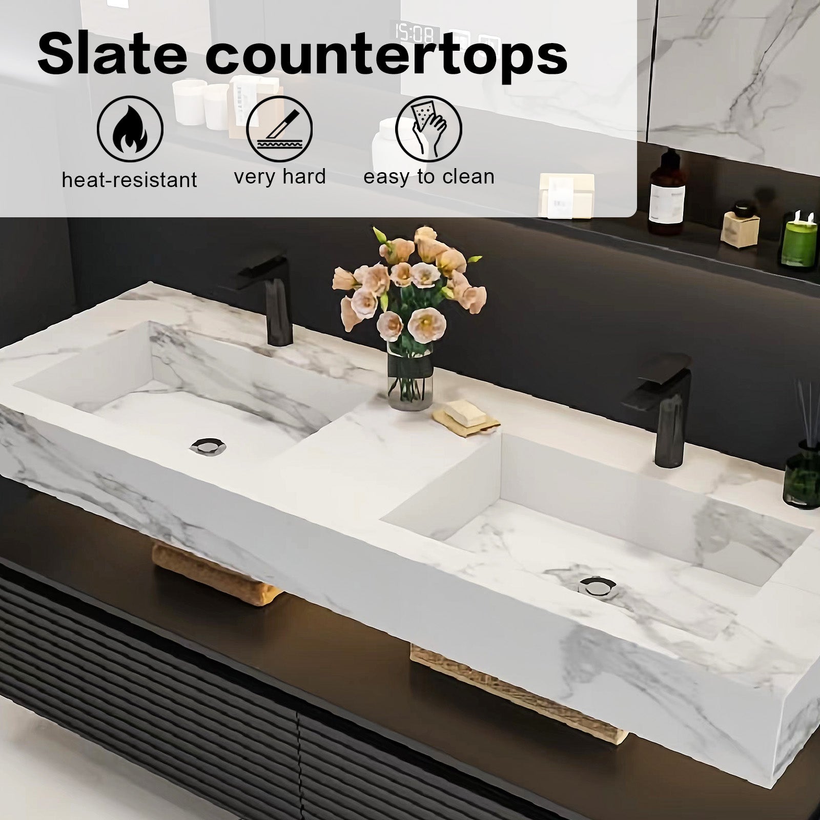 High-End Materials: Our bathroom sets are crafted from high-end solid wood, taking your space to new heights of luxury and durability. Solid wood has strong durability and good waterproof performance, which effectively extends the service life of the bathroom cabinet. The rich beauty of solid wood ensures long-lasting functionality, while scratch-resistant and heat-resistant slate countertops add durability and visual appeal to your bathroom oasis.