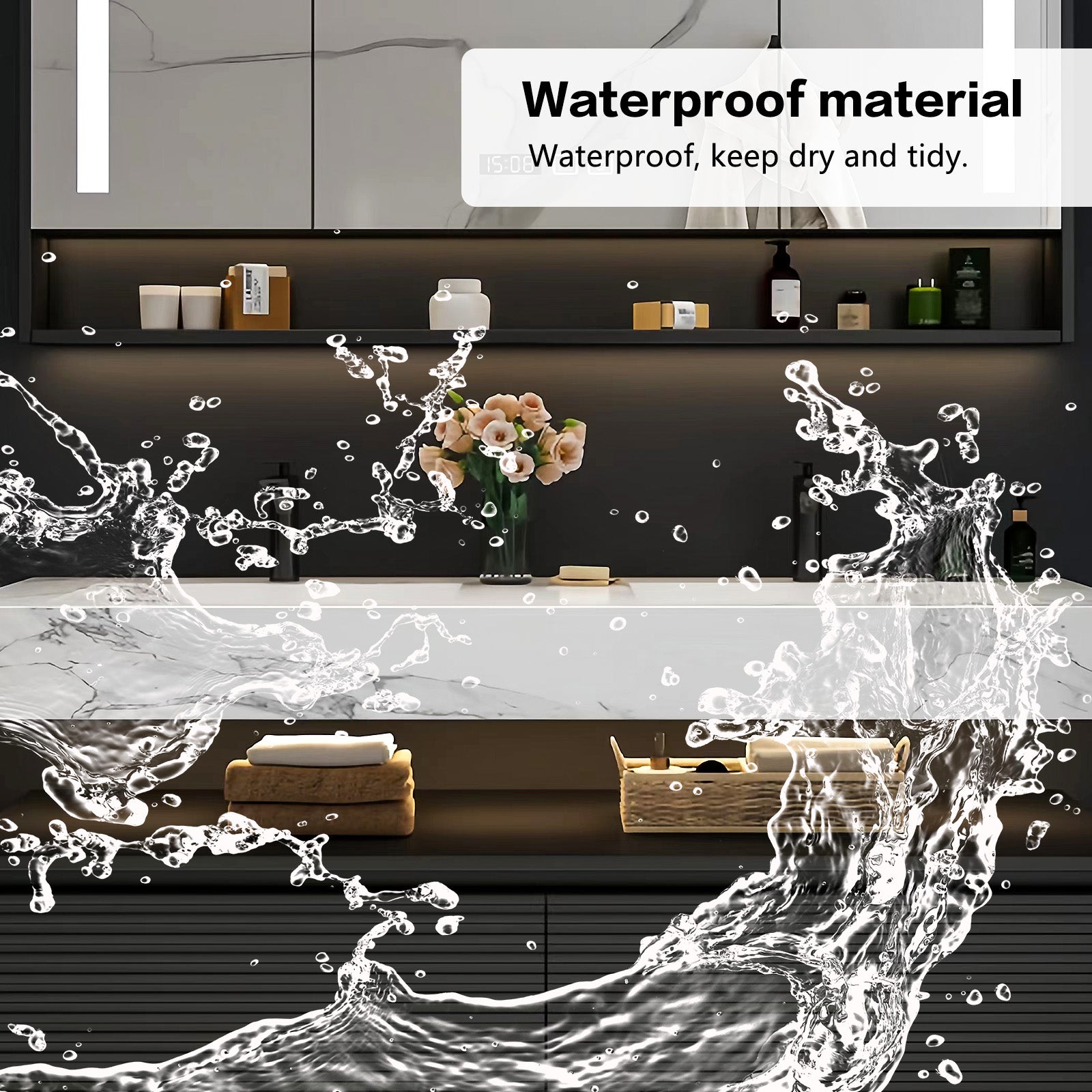 Spacious Storage Space: Two extra-large drawers and a smart mirror cabinet provide ample storage space, providing plenty of room for all your essentials. From toiletries to towels, our spacious storage solutions keep everything organized, transforming your bathroom into a haven of clutter and tranquility.