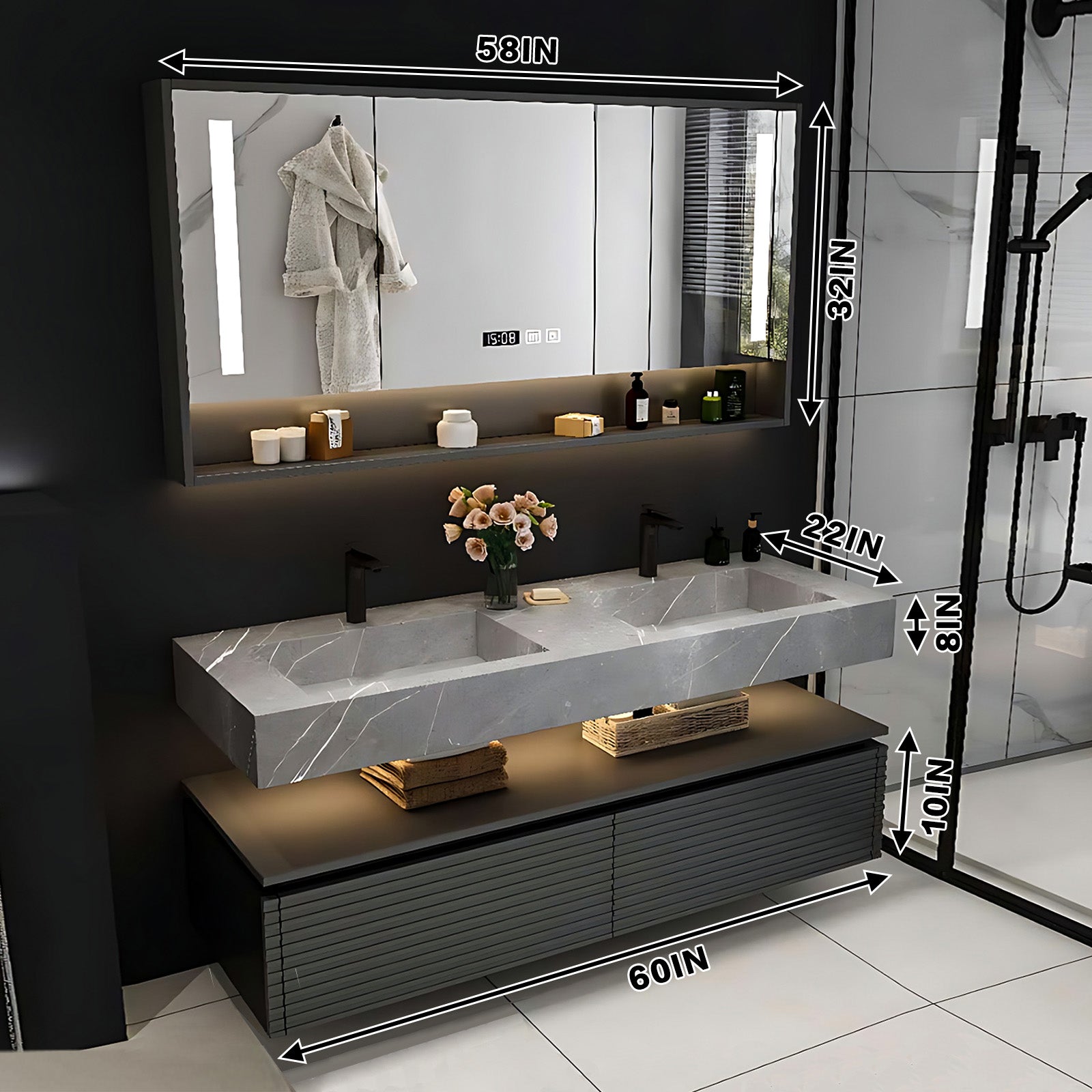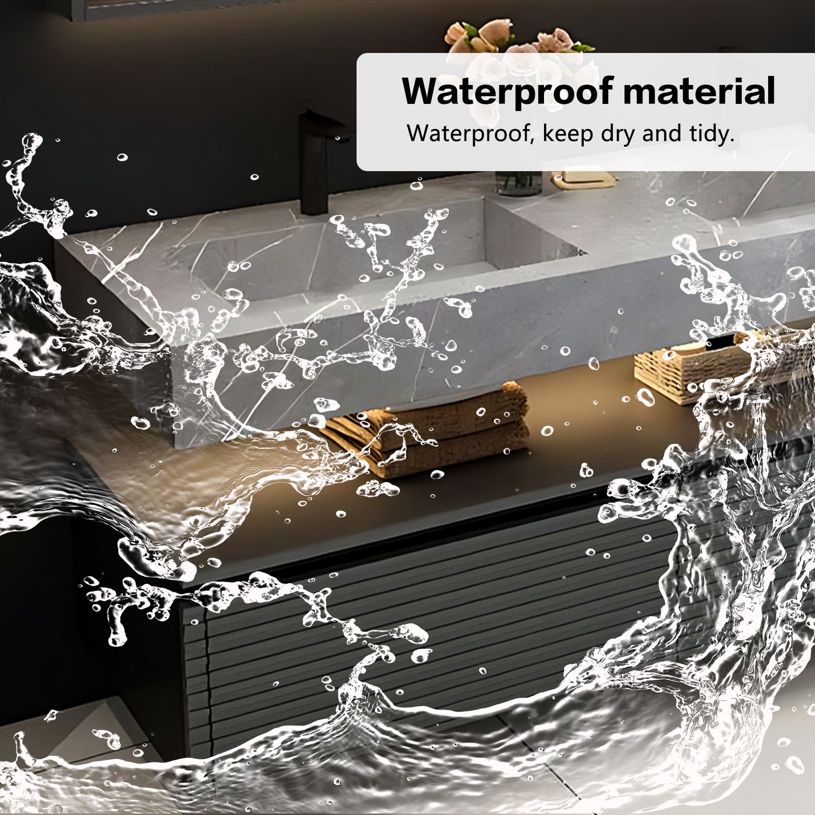 Seamless Design Harmony: Our bathroom cabinets effortlessly blend various design elements to create a cohesive and stylish piece of furniture as a whole. Featuring black striped drawer fronts, semi-open storage units and stylish gray slate tops, our vanity exudes visual appeal and enhances the overall beauty of your bathroom space.