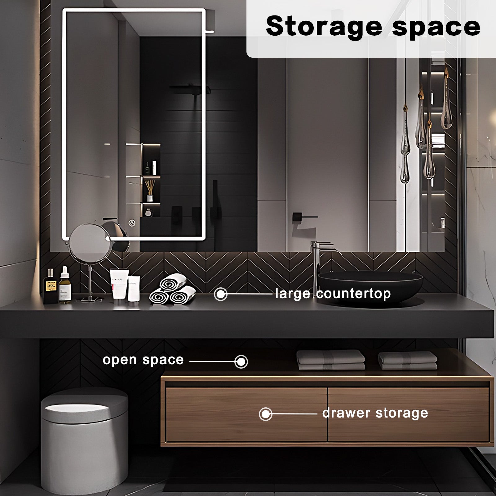 Smart Defogging Mirror for Clear Reflections: One of the standout features of this bathroom vanity is its innovative smart defogging mirror. This cutting-edge technology automatically clears away any fog or steam that accumulates on the mirror surface, ensuring that you always have a clear and undistorted reflection. With this vanity, you can enjoy a crystal-clear reflection every time you step in front of the mirror, enhancing your bathroom experience.