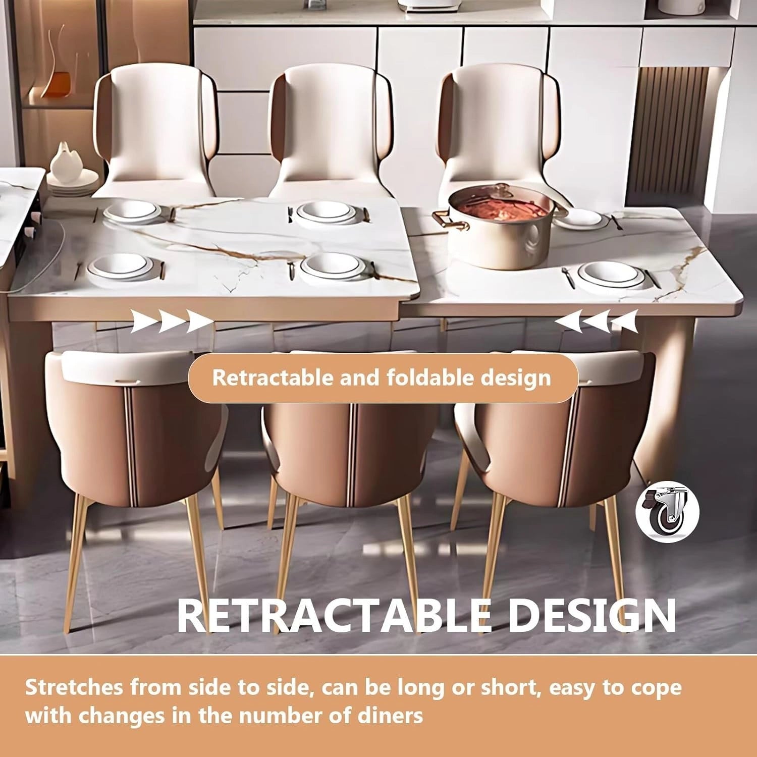 Modern Luxury Style: Featuring a textured finish that blends log elegance with modern luxury, this piece boasts a patterned tabletop and a retractable design brimming with fashion-forward flair. It creates a sleek, lavish space perfect for both formal gatherings and casual get-togethers.