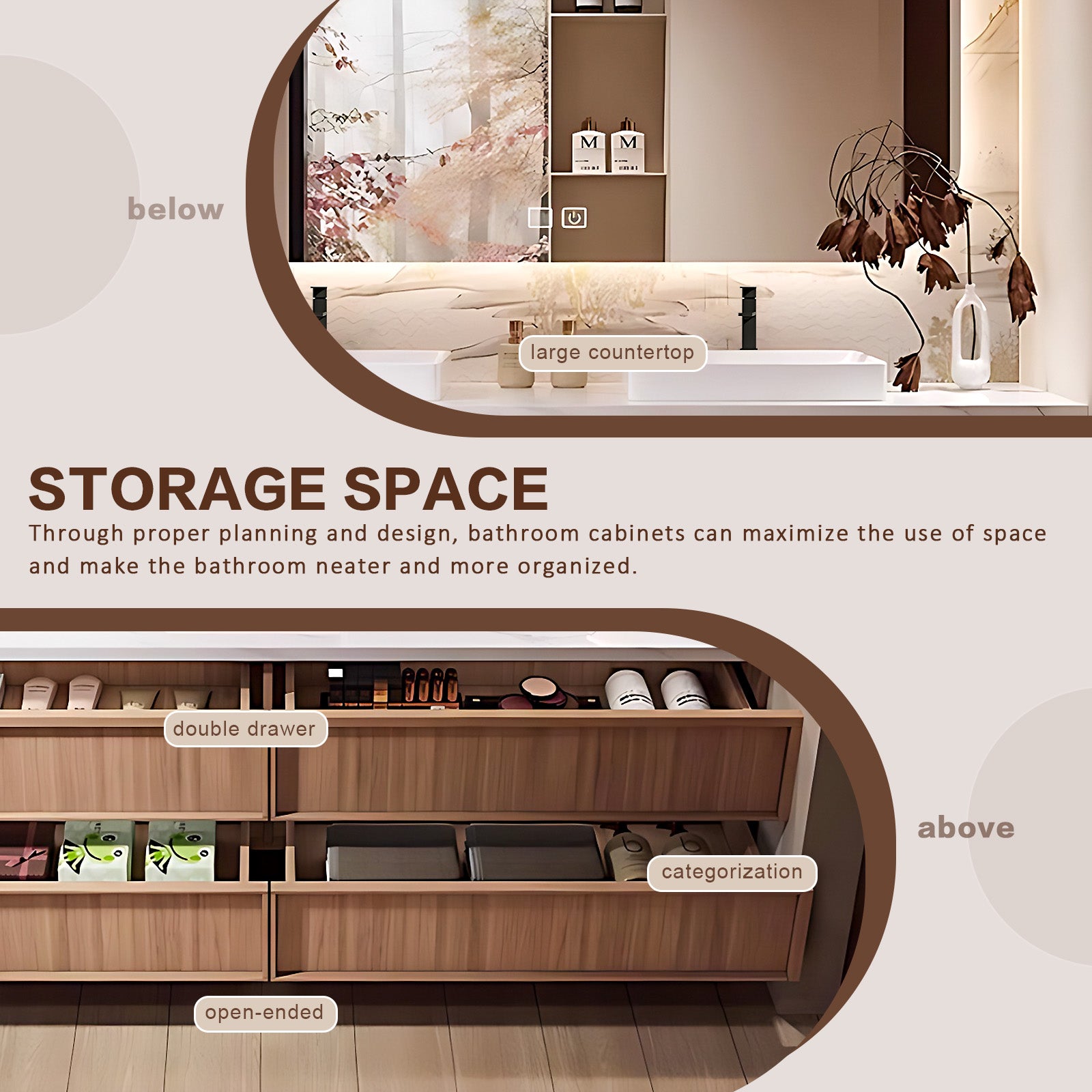 Ample Storage Solutions:Our extra-large drawers offer unparalleled storage capacity, transforming your bathroom into a luxurious organization sanctuary. Whether it's toiletries, towels or everyday essentials, our spacious compartments keep everything neatly organized and easily accessible. Featuring a hanging design that maximizes convenience and cleanliness, there is plenty of space for toiletries while ensuring easy maintenance.