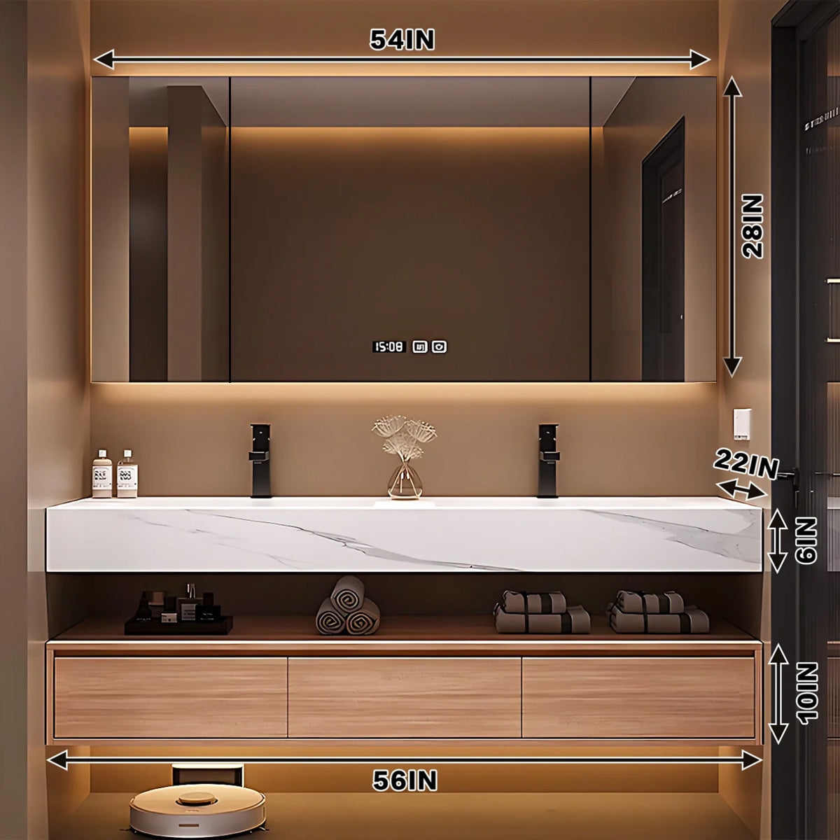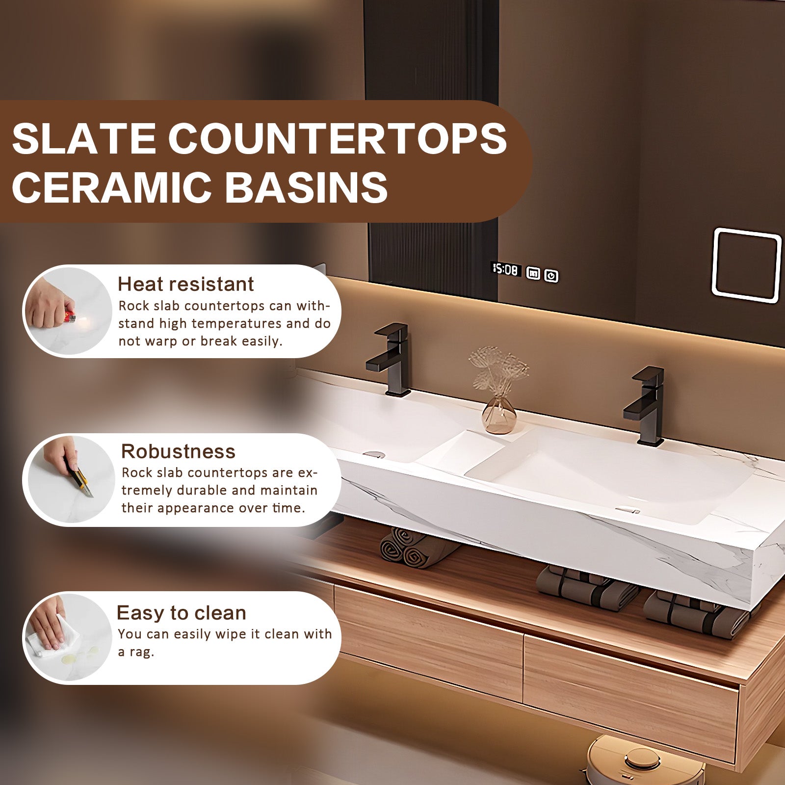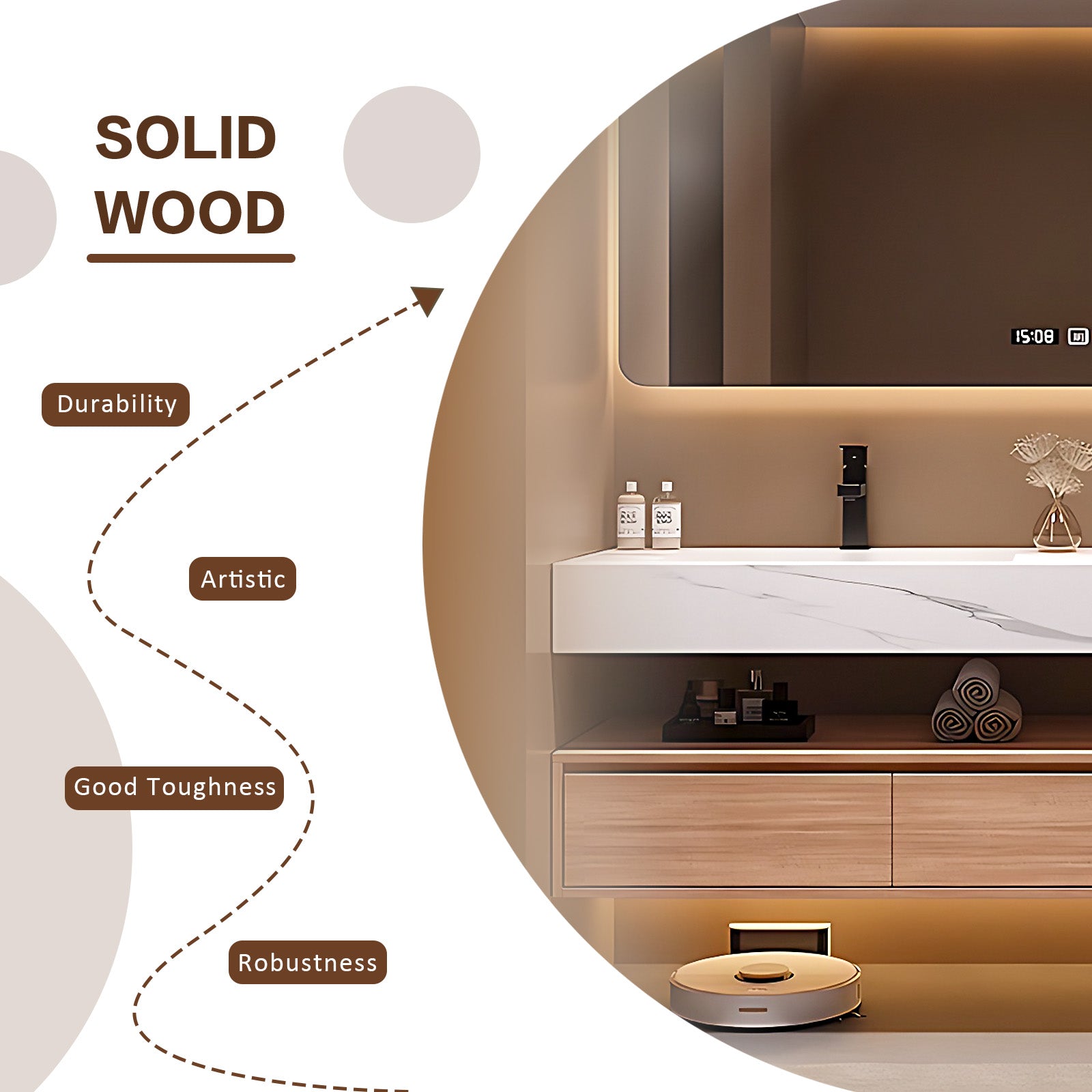 Large Storage Space: Unleash the full potential of your vanity set with ample storage options. Spacious drawers and open compartments provide versatile organization for cosmetics, toiletries, and essentials, keeping your bathroom clutter-free and effortlessly chic. Rediscover the joy of an orderly space as you indulge in the luxury of our Solid Wood Double Sink Bathroom Vanity Set with Smart Backlit Mirror.