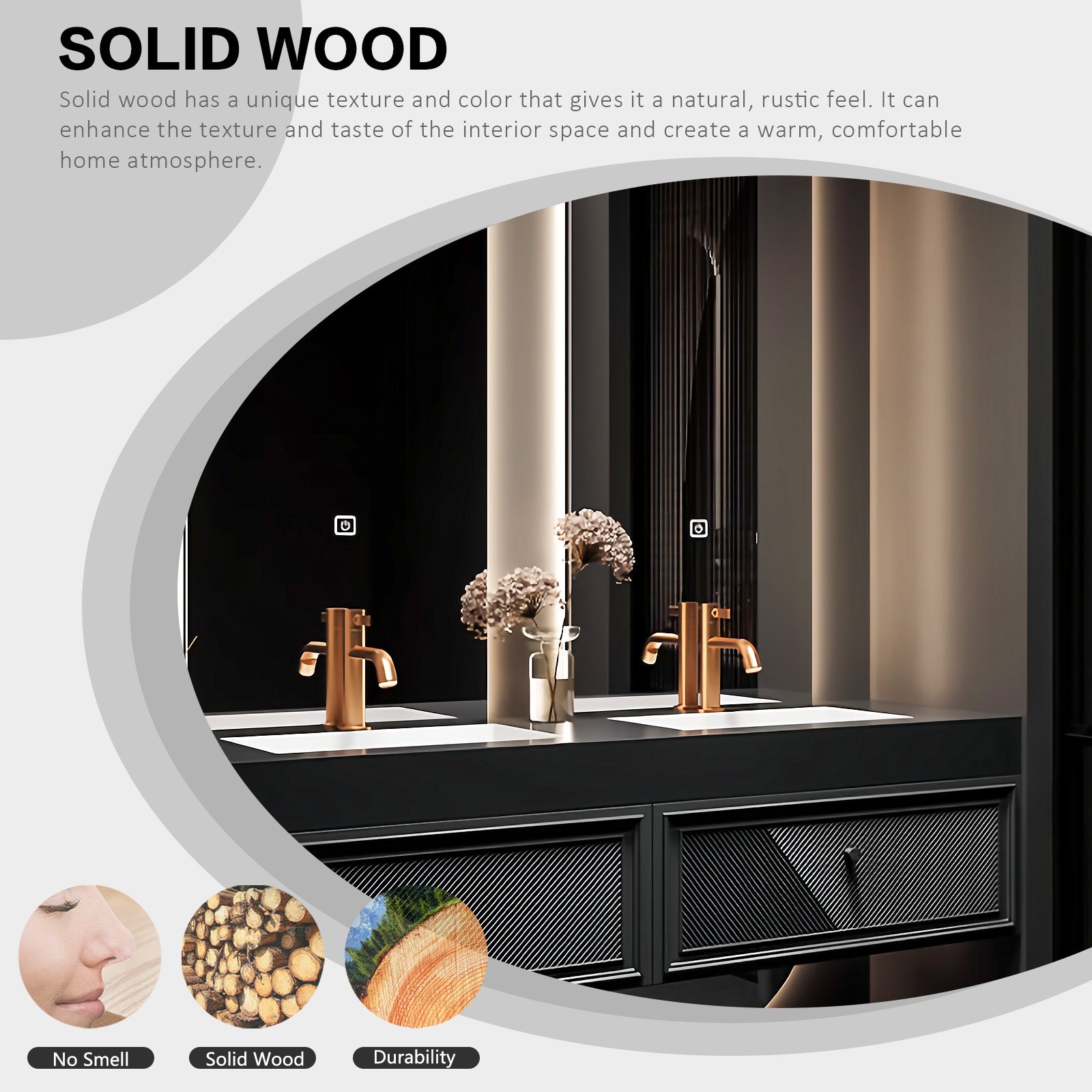 High-End Materials: Discover the excellence of our bathroom vanities made from carefully selected high-quality solid wood. Our wood is engineered to withstand high temperatures and resist deformation, ensuring the safety and longevity of your washbasin. Our dense wood is sourced from trees with a long growth cycle of 25-30 years, ensuring durability and stability, giving your space a sustainable appeal that will last for generations.
