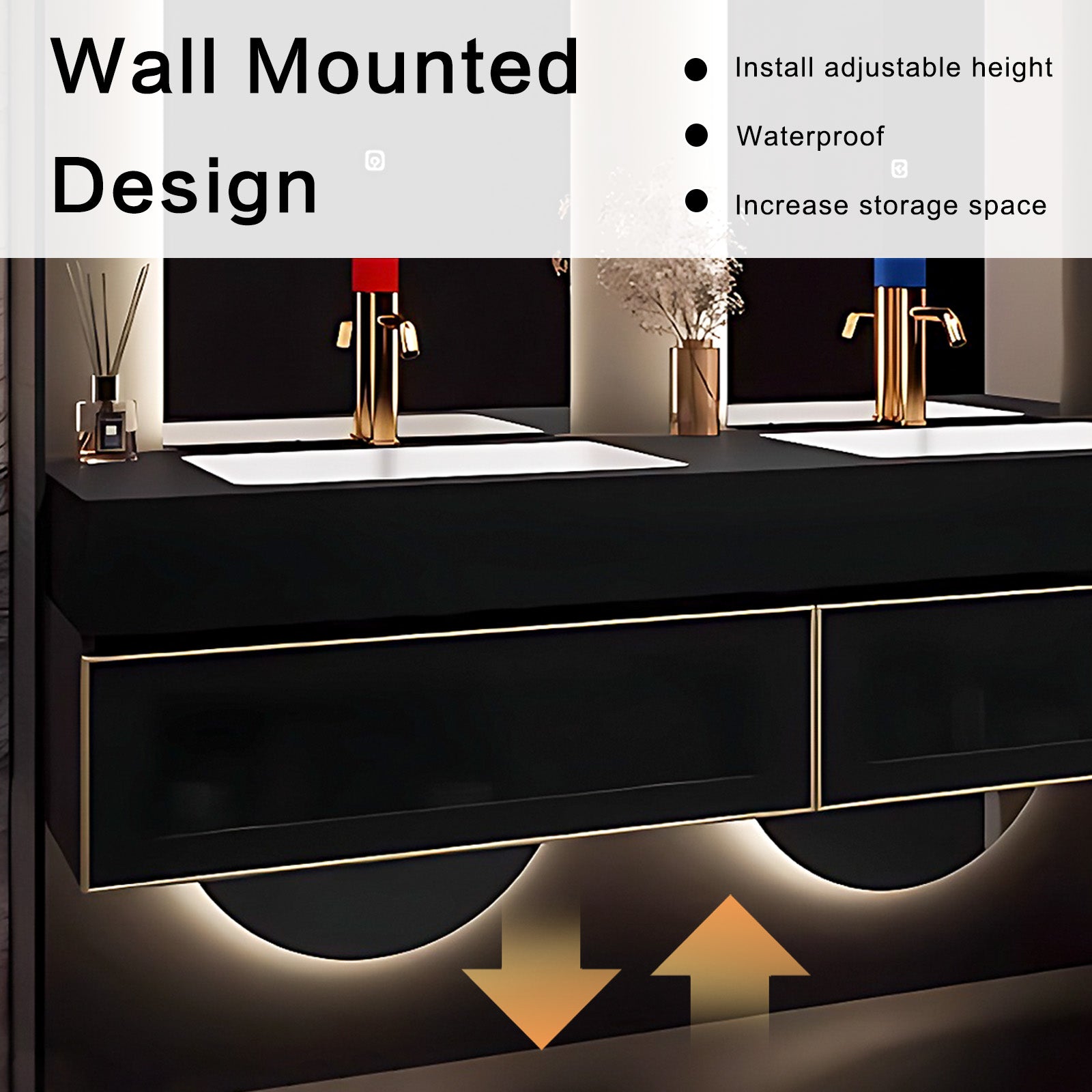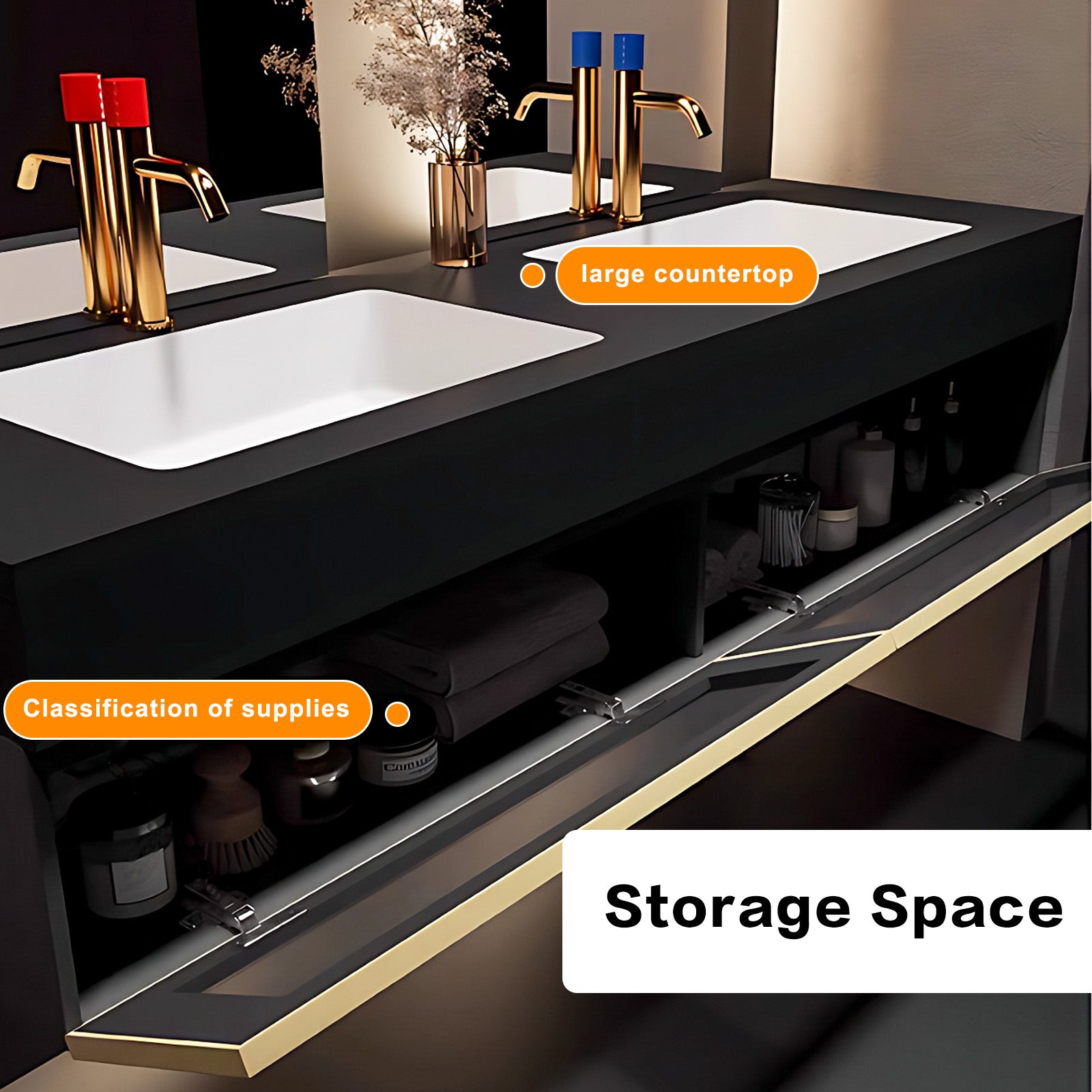 Elegantly Integrated Design: Immerse yourself in the seamless fusion of design elements showcased in our bathroom cabinets, meticulously crafted to embody style and sophistication. The gold border drawer and metal faucet complement each other, effortlessly complement the marble-textured slate countertops and stunning gold all-copper faucets. Together, these elements create a harmonious and visually captivating ensemble that elevates the overall aesthetics of any bathroom.