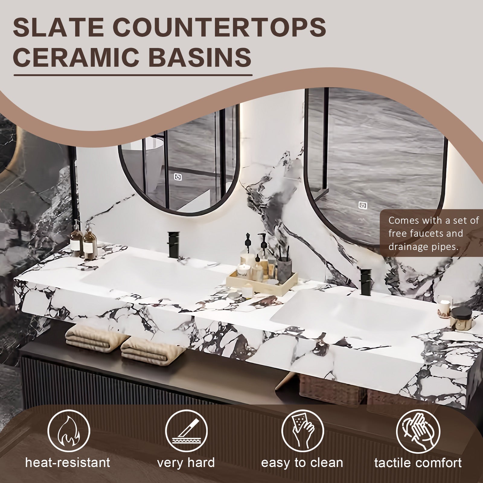 Striped Design Bathroom Vanity: Embrace the glamor of modern elegance with our collection of wavy stripe bathroom vanities. Featuring a stylish black embossed striped wave design, our vanity embodies a seamless blend of style and function. Paired with chic slate countertops with a marble vein pattern, this set exudes a modern sophistication that's perfect for a modern home.