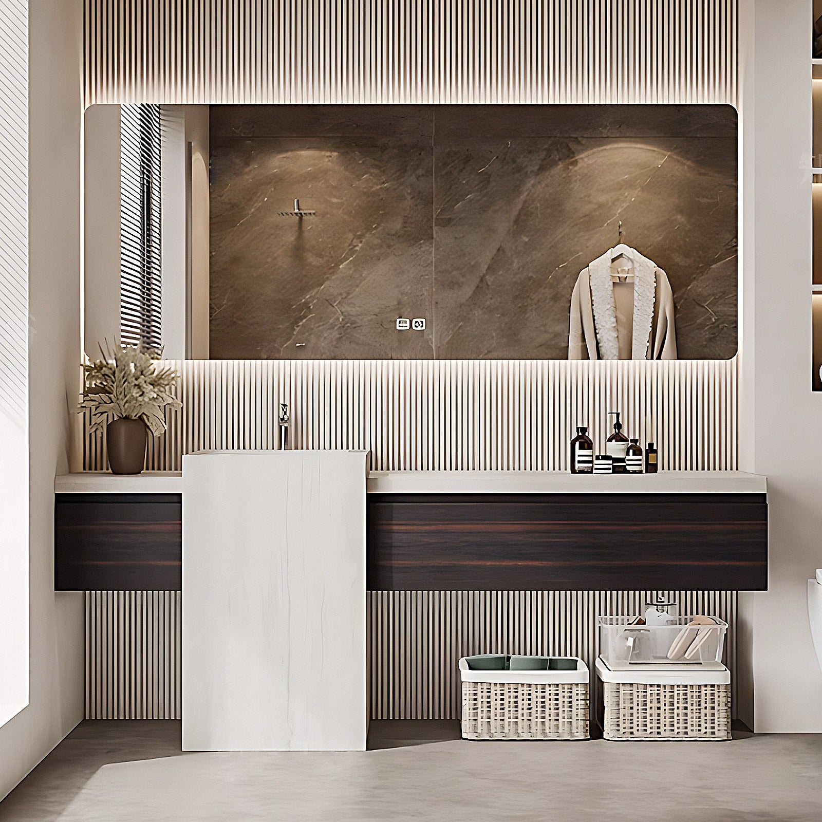 Smart Mirror: The smart mirror streamlines your morning routine with easy access to lighting and information. Anti-Fog technology keeps the mirror clear, even after steamy showers.