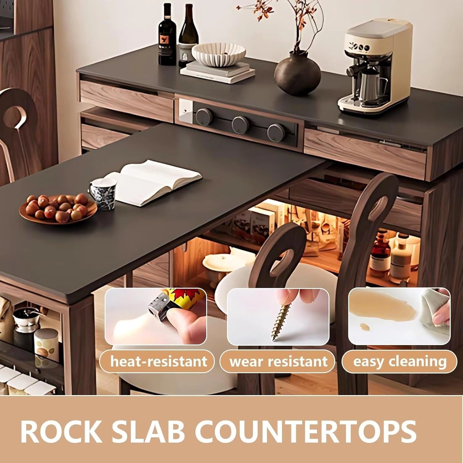 Sturdy & Durable Materials: Both the tabletop and island countertop are crafted from rock slab—boasting exceptional hardness and excellent deformation resistance. The solid wood cabinet delivers robust load-bearing capacity for long-lasting reliability.