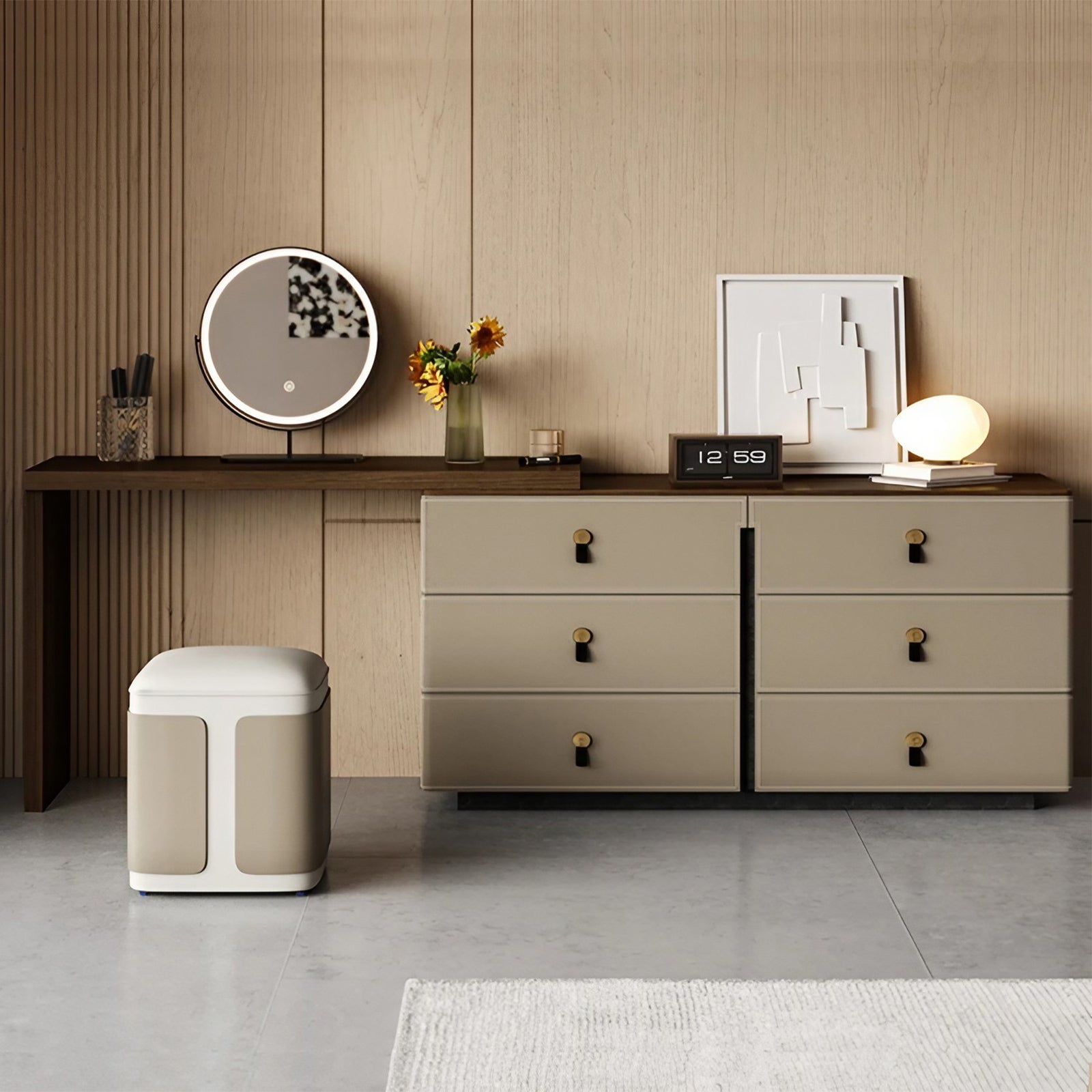 Discover the modern beige solid wood 6-drawer dresser with adjustable design. Made with premium solid wood and leather-textured fronts, it features spacious storage, a modular structure, and elegant round handles—perfect for any room.