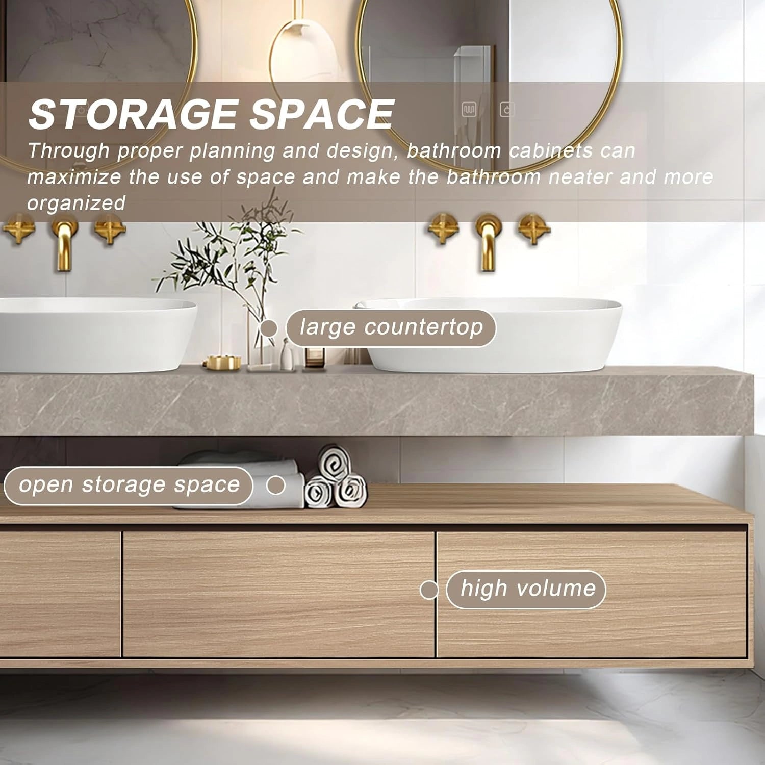 Premium Textured Materials: The countertop is crafted from rock slab, boasting exceptional hardness and high durability. The ceramic sinks feature a smooth, delicate finish for easy cleaning, while the solid wood wall cabinets deliver excellent stability and sturdiness.