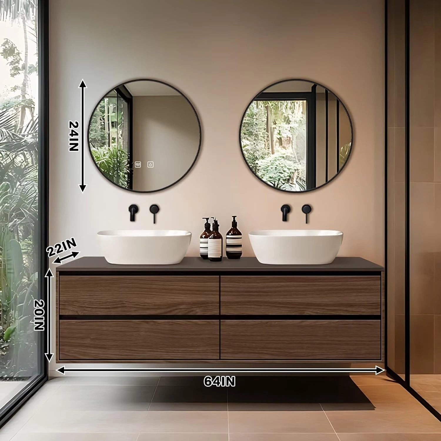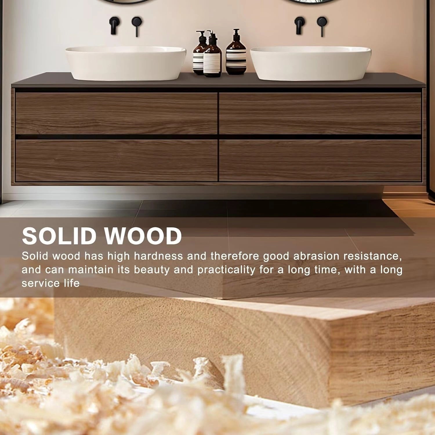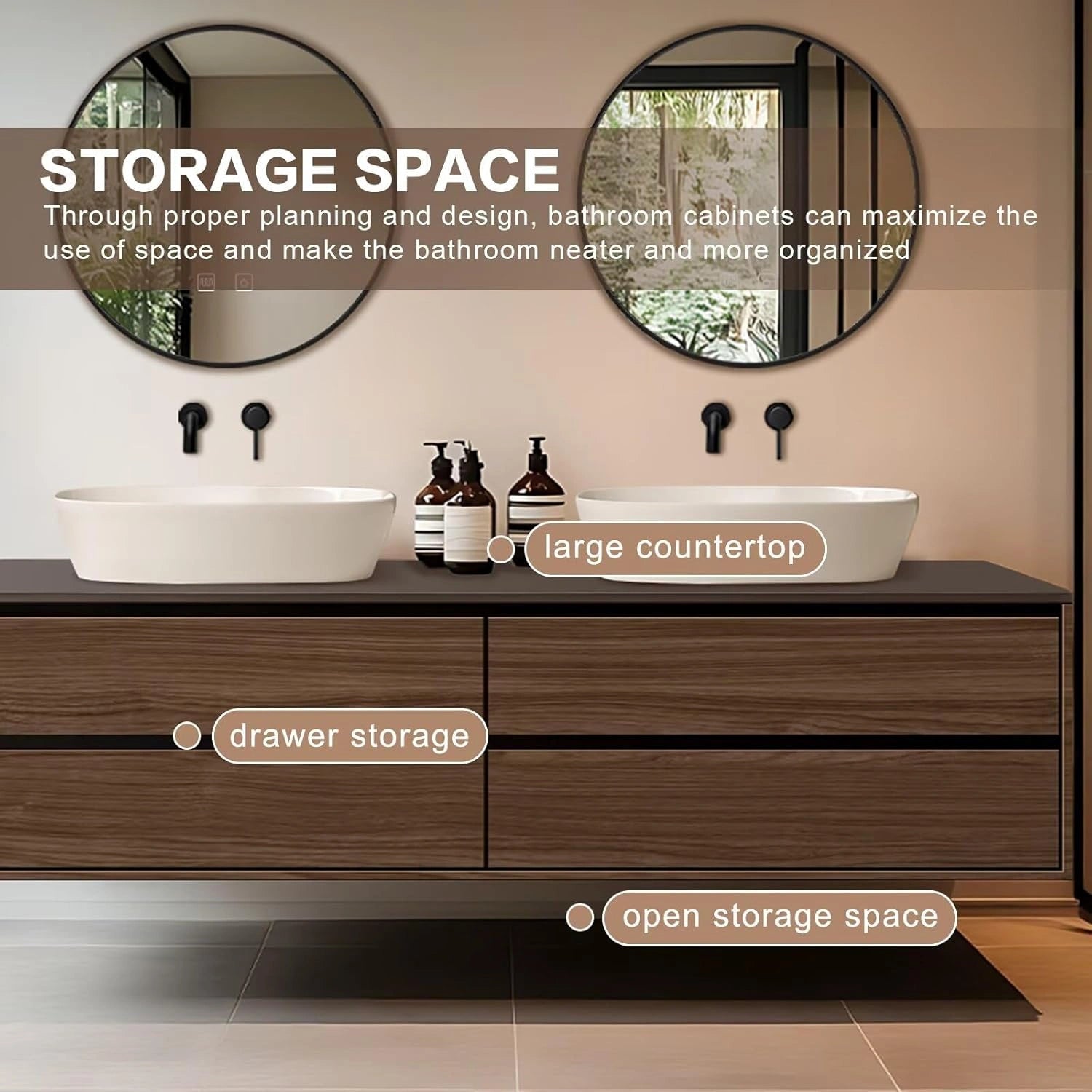 Modern Style: The straight line cabinet style is simple and sharp, the texture of the wood cabinet surface is turned into natural elements bringing warmth and texture; the round mirror is ingeniously decorated to show the unique charm of modern minimalism and natural integration Double Sinks Design: It's not only comfortable for all family members to have double sinks at the same time to save washing time in the rush hour, but also provide more space to store toiletries that we could categorize and organize to prevent cross-handling