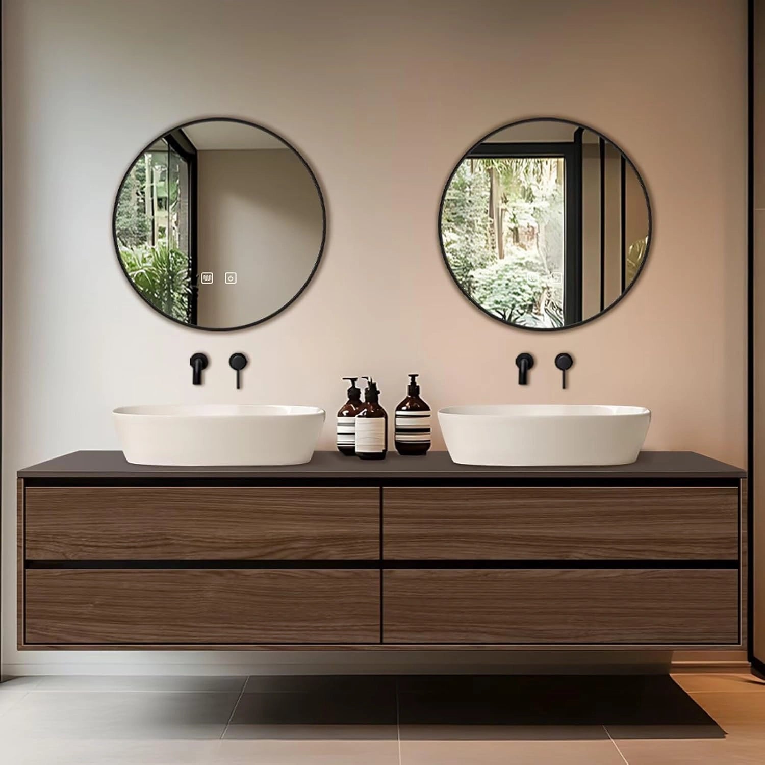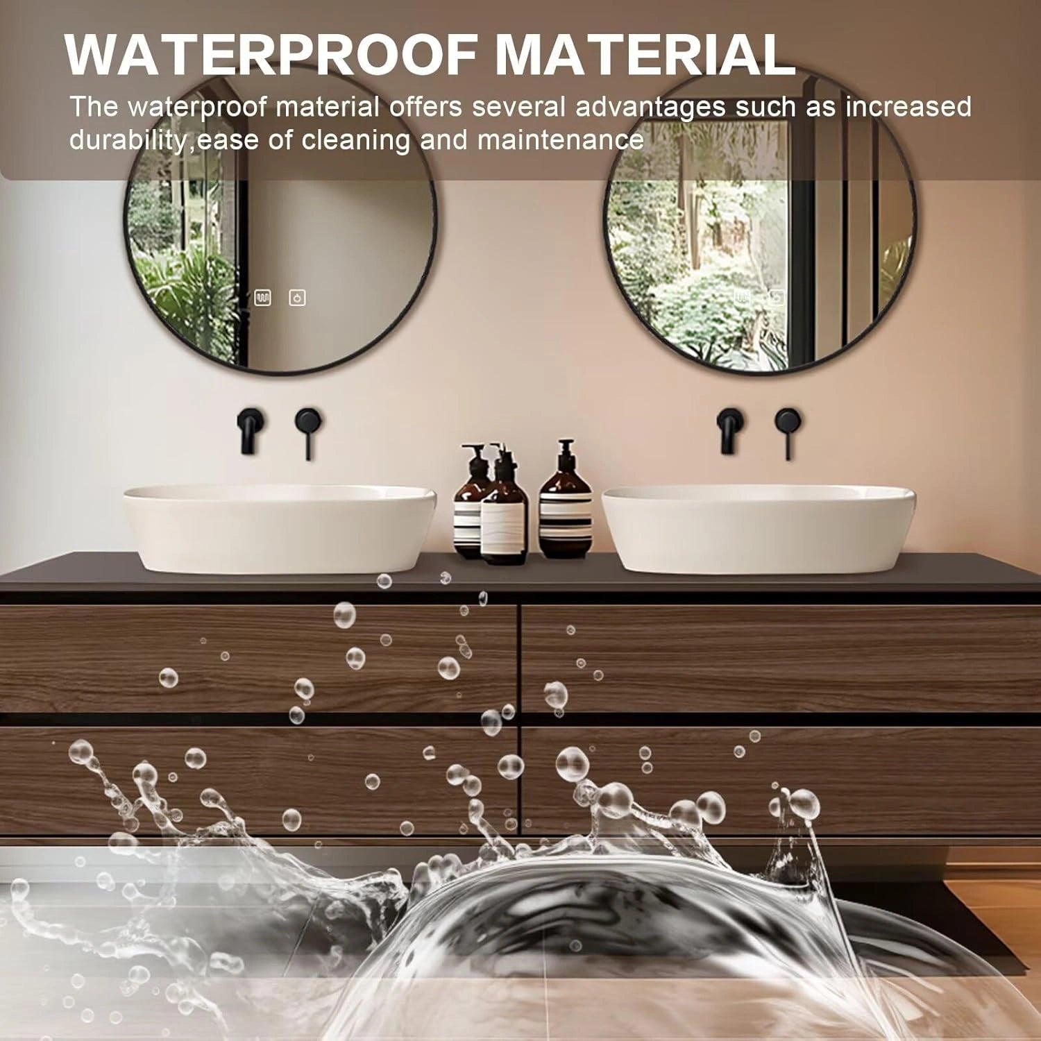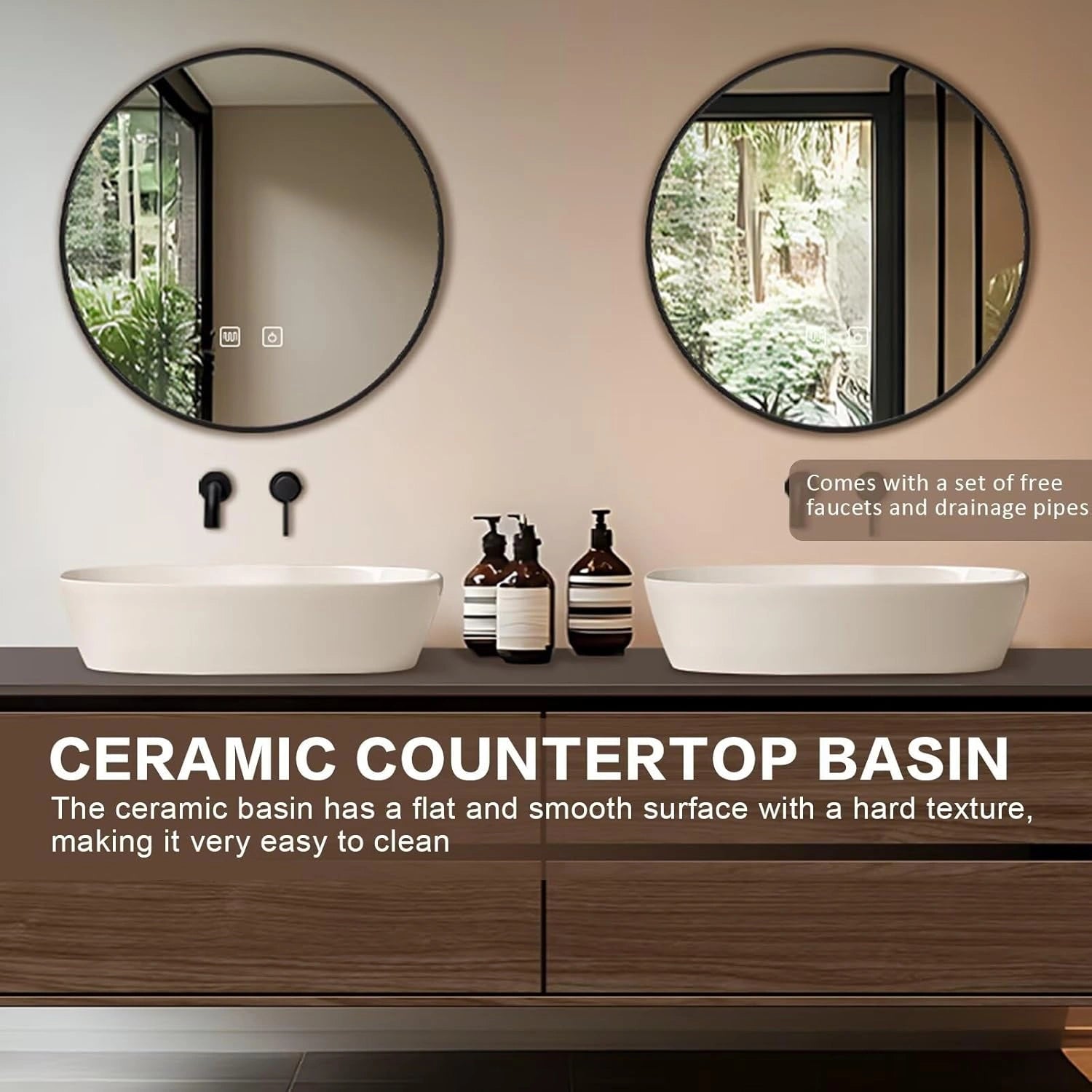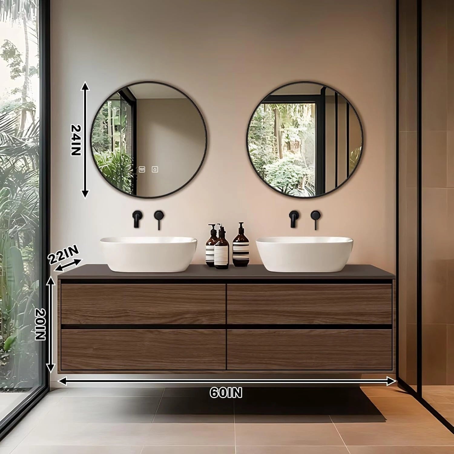 Modern Style: The straight line cabinet style is simple and sharp, the texture of the wood cabinet surface is turned into natural elements bringing warmth and texture; the round mirror is ingeniously decorated to show the unique charm of modern minimalism and natural integration Double Sinks Design: It's not only comfortable for all family members to have double sinks at the same time to save washing time in the rush hour, but also provide more space to store toiletries that we could categorize and organize to prevent cross-handling