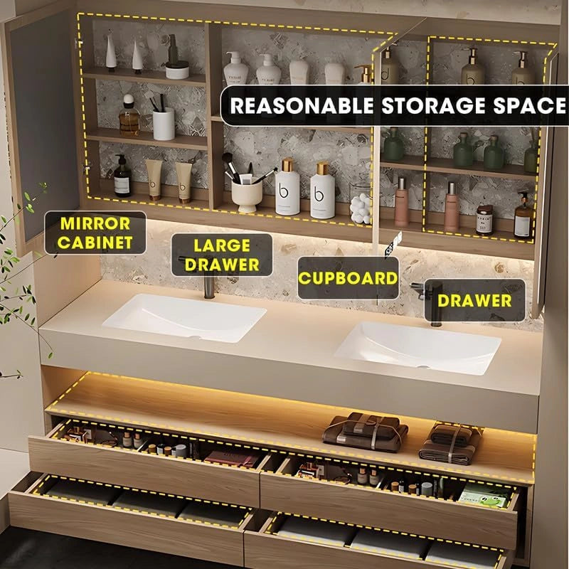 Large Storage Space: The storage cabinet optimizes the bathroom storage. With double drawers and a hollow storage rack under the sink, it expands capacity while achieving zoned storage. The design is considerate, taking into account both functionality and privacy, ensuring that the bathroom space is always clean, beautiful and easy to access.
