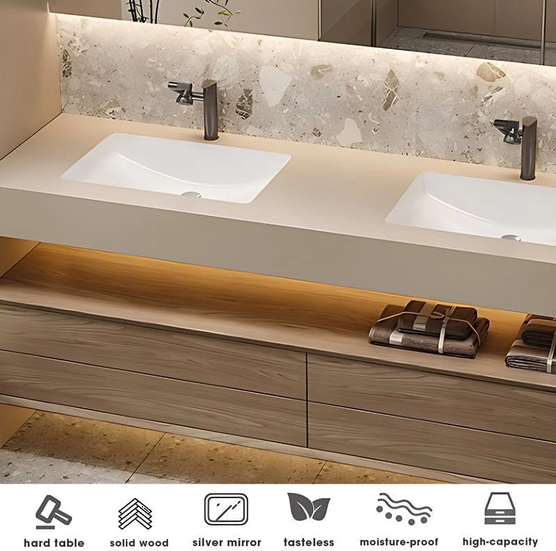 Dual-color Combination: Solid wood drawers paired with a plain white stone countertop. The dual-color set combines modern simplicity with classic retro style. The color collision creates a unique bathroom atmosphere, enhancing the overall aesthetic with visual contrast, and combines the charm of both styles.
