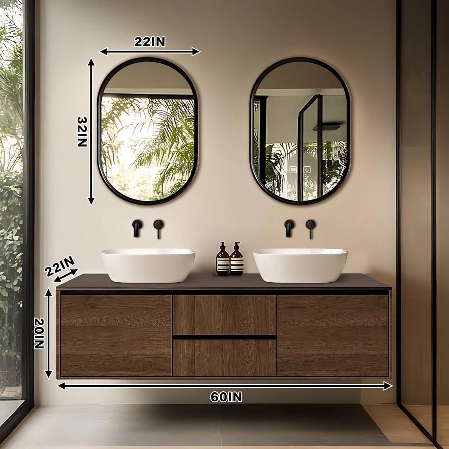 Simple & Elegant Style: The dark wood-toned cabinet exudes a calm, sophisticated vibe with its clear, natural wood grain, bringing rustic charm and warmth to your space. Framed with sleek black borders, the two round mirrors add a subtle touch of refinement and modern flair to the overall design.